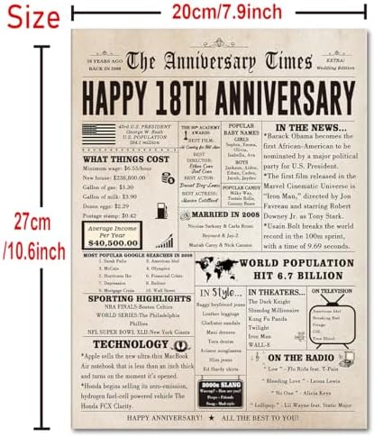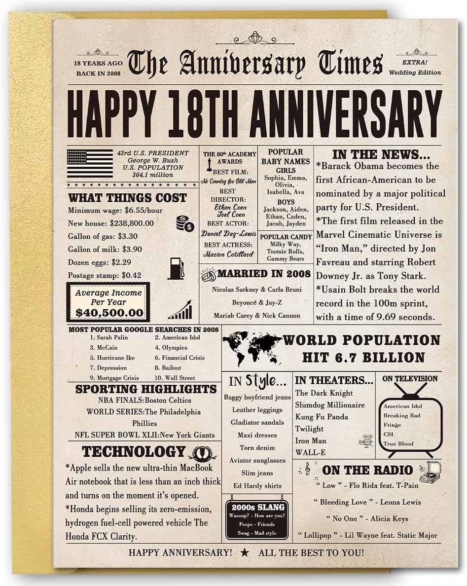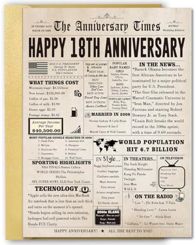 • Product Introduction– Find interesting one a single sided 18 year Anniversary card for your lover. The cards contain some specific events which can help you review interesting facts with with you loved