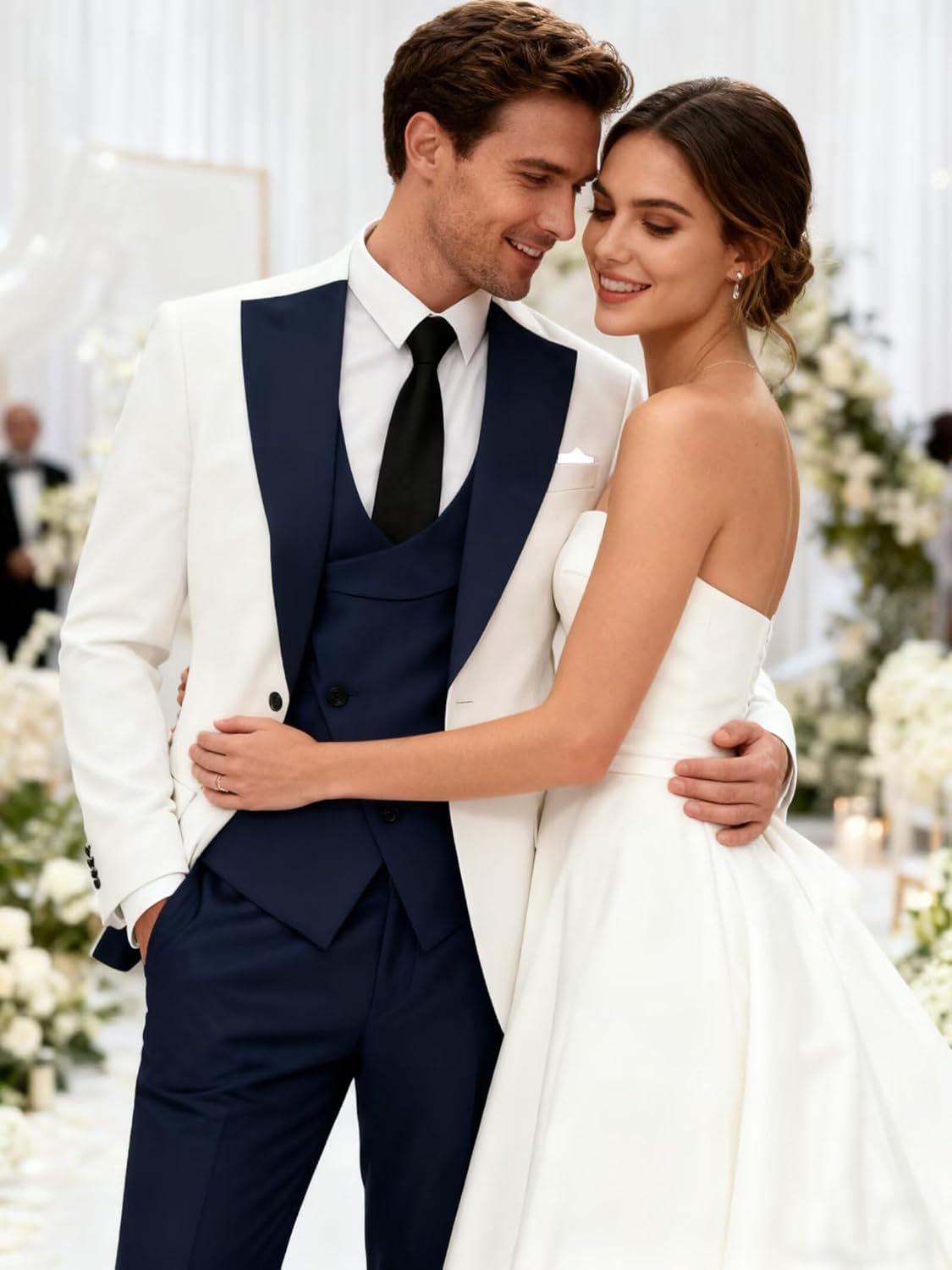 • 【Material】- White and Navy Blue Tuxedo for Men made of Polyester and Viscose. This White Navy Suit is comfortable,absorbent,good air permeability which can reduce skin irritation,and easier to wash,providing a comfortable wearing,experience.