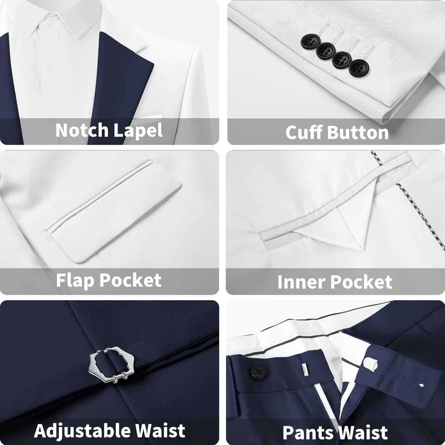 • 【Good Gift】- White and Navy Blue Suits for Men suitable for autumn,winter and spring,buy a handsome set of clothes and give it to Grandpa, Dad, Son,Boyfriend,Hunsband,Groomsmen and give it to someone who wants to thank. Made with good quality fabrics, they make you look slimmer, It can better reflect your good figure.