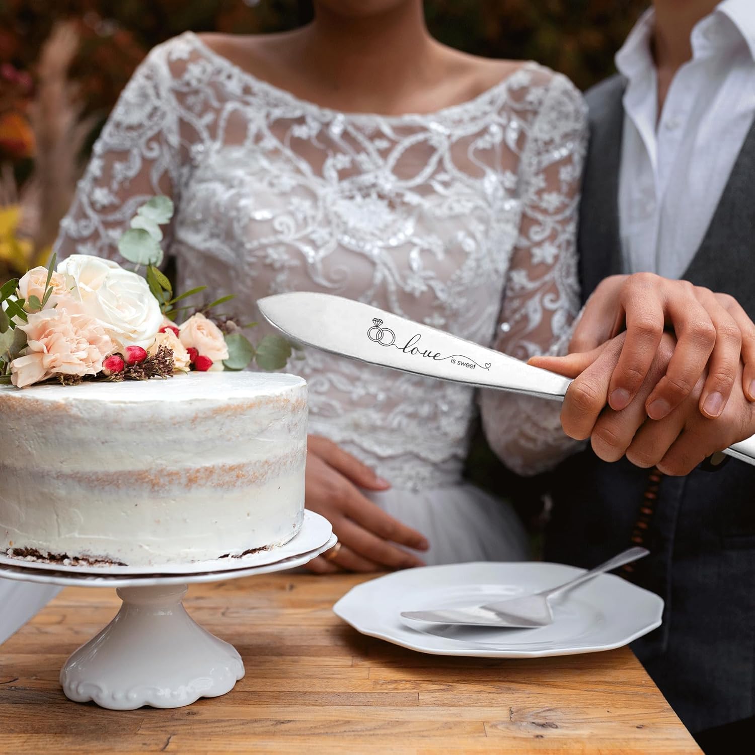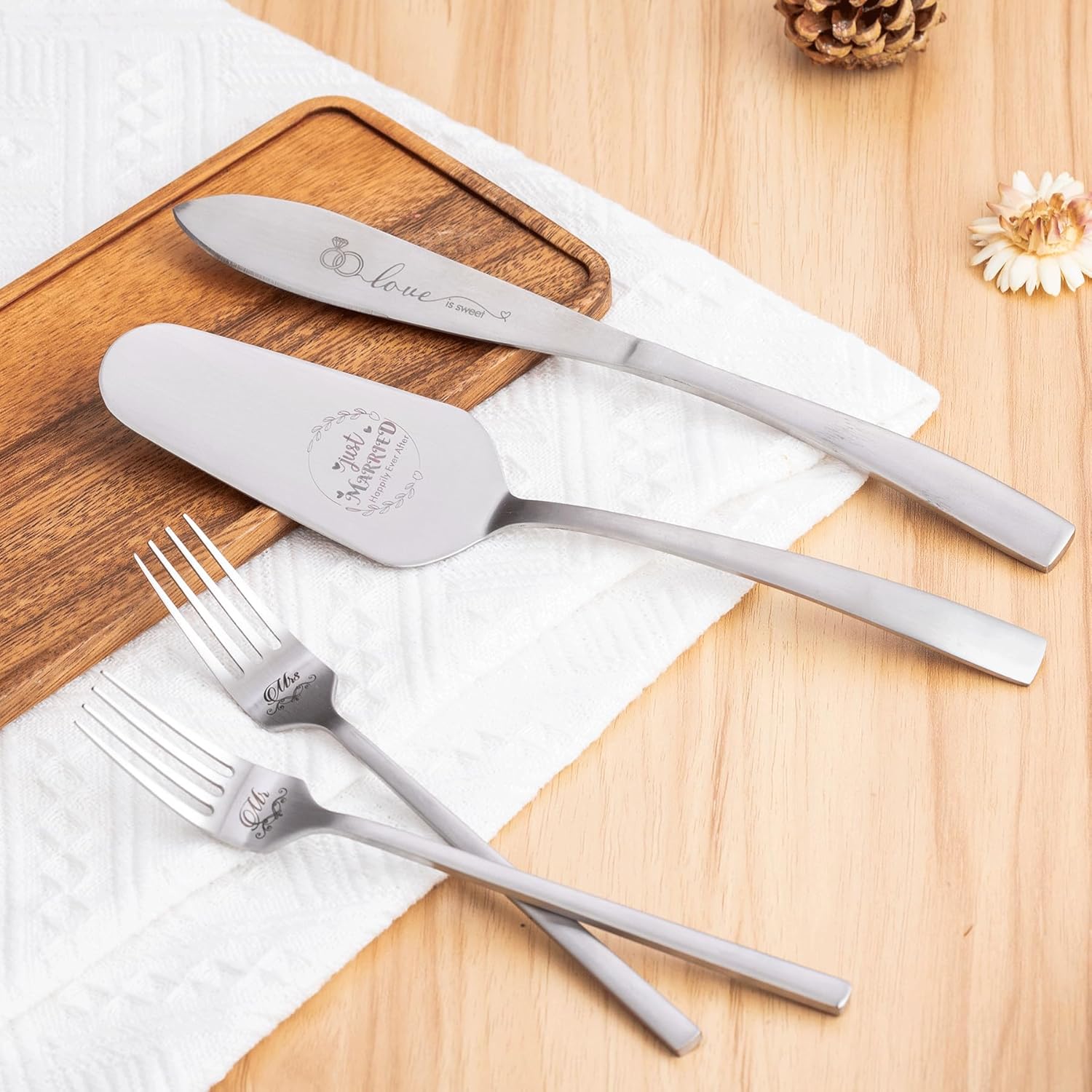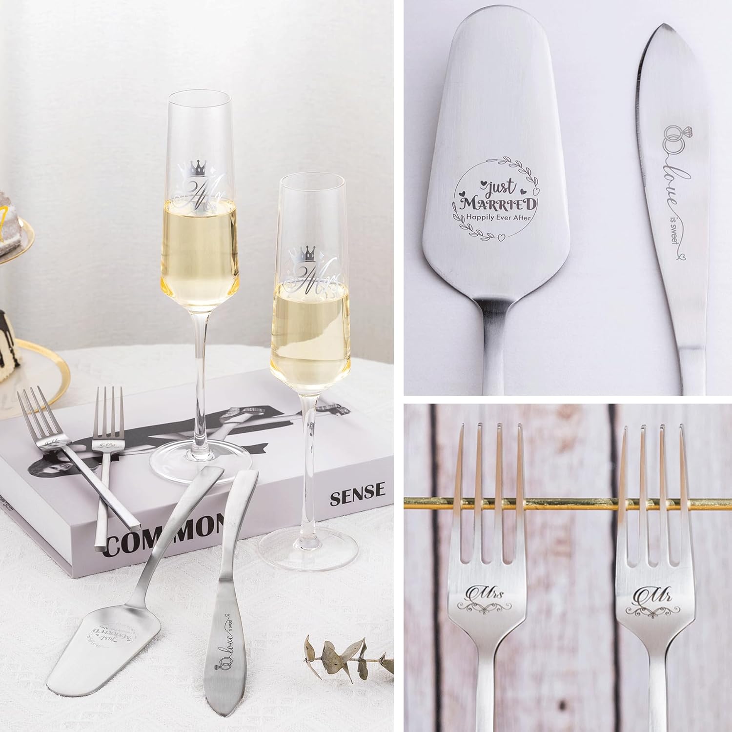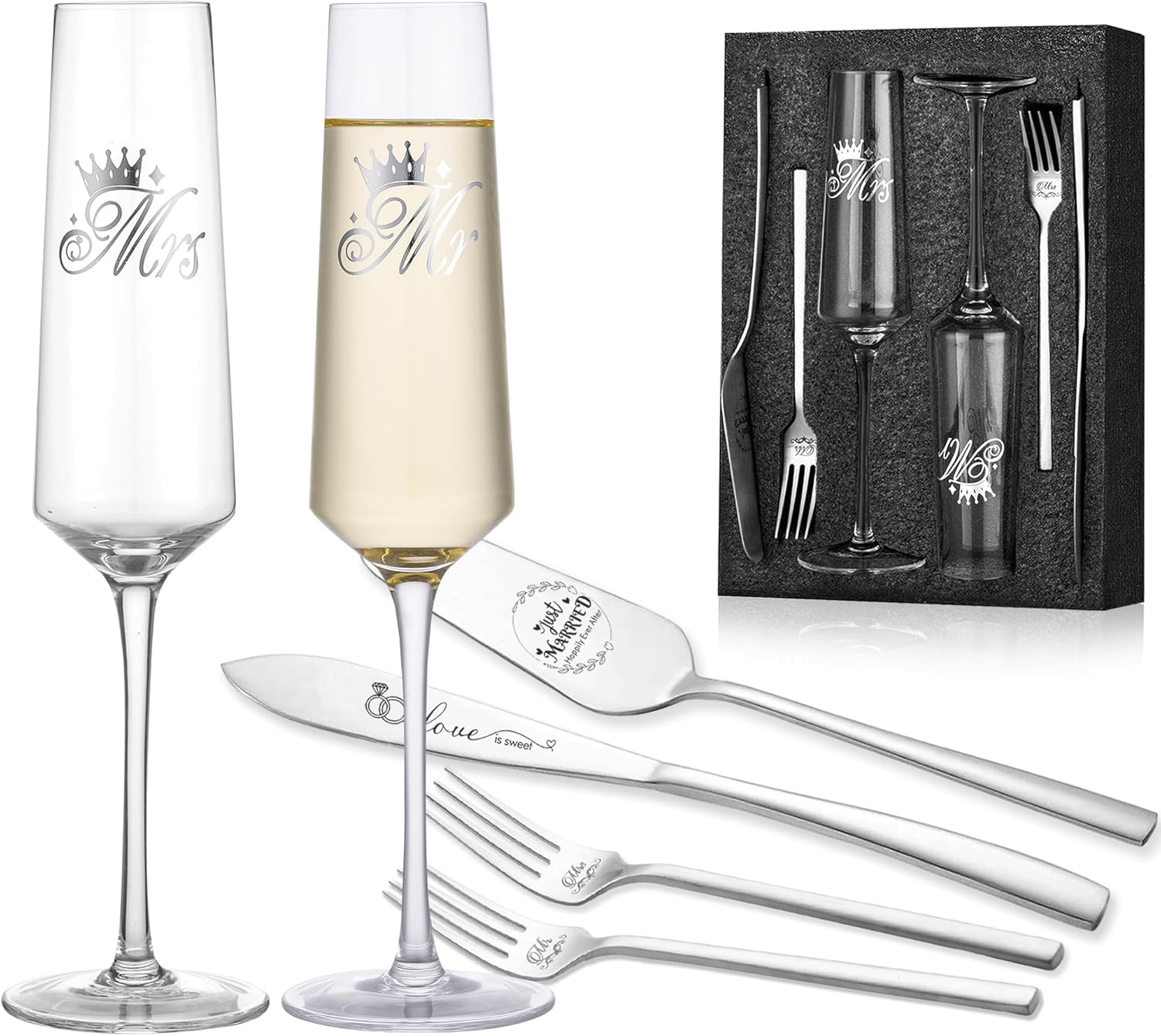 - 【Cake Cutting Set for Wedding】 Make your wedding unforgettable with our silver wedding knife and cake server set. This set includes 2 ✖ Bride and groom champagne flutes, 1✖ cake knife, 1✖ cake server, 2 ✖ forks, made from food grade stainless steel, and engraved the words “love is sweet, just married Happily ever after, mr and mrs” add a romantic touch. Its trendy and modern design never goes out of style, Order now and make your wedding day perfect!