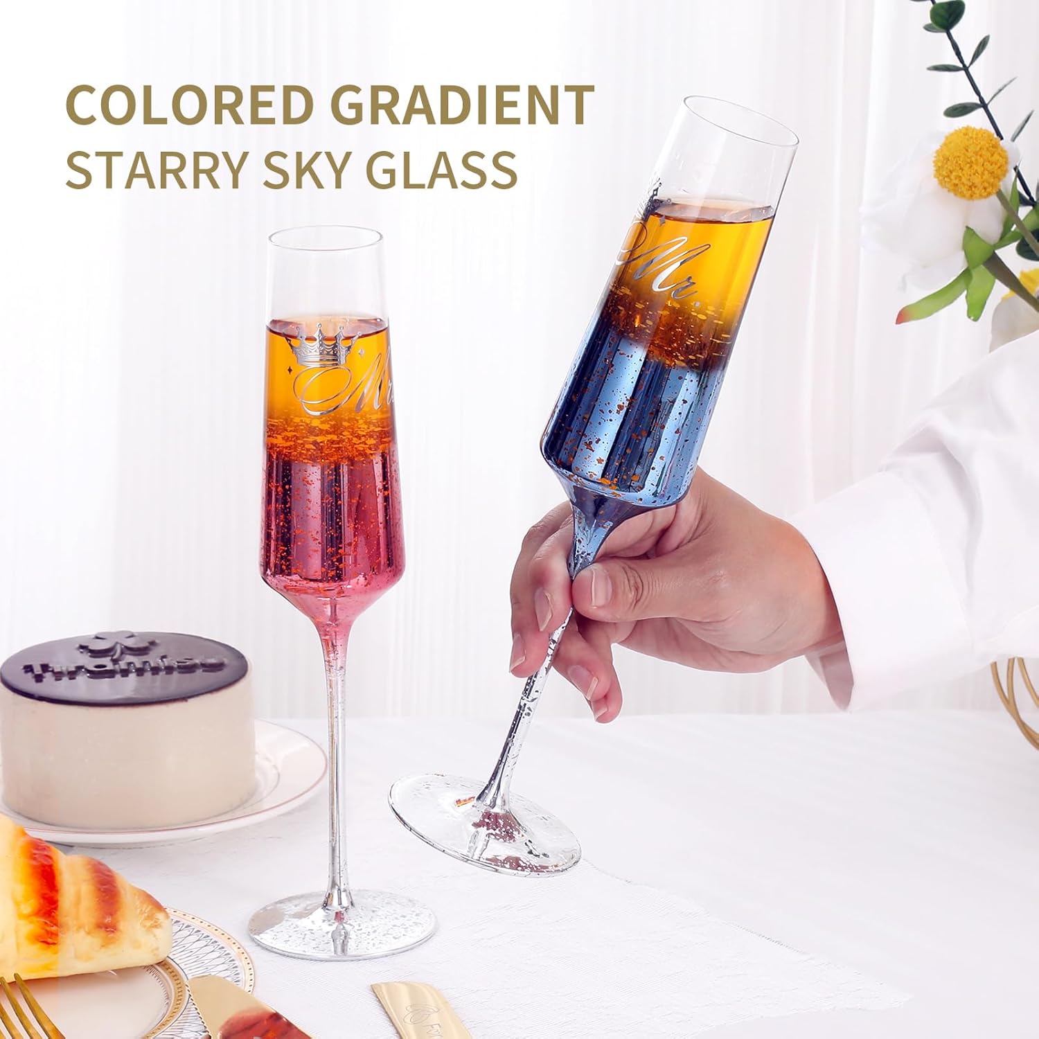 • Gradient colour champagne flutes: wedding champagne flutes are made with an electroplating process, which makes the 🍴glass pouring champagne, under the sunlight, presents a gorgeous visual effect, These cups are not just functional drinking utensils, they are exquisite pieces of modern art that will become an unforgettable experience shared with fine wine and good company.