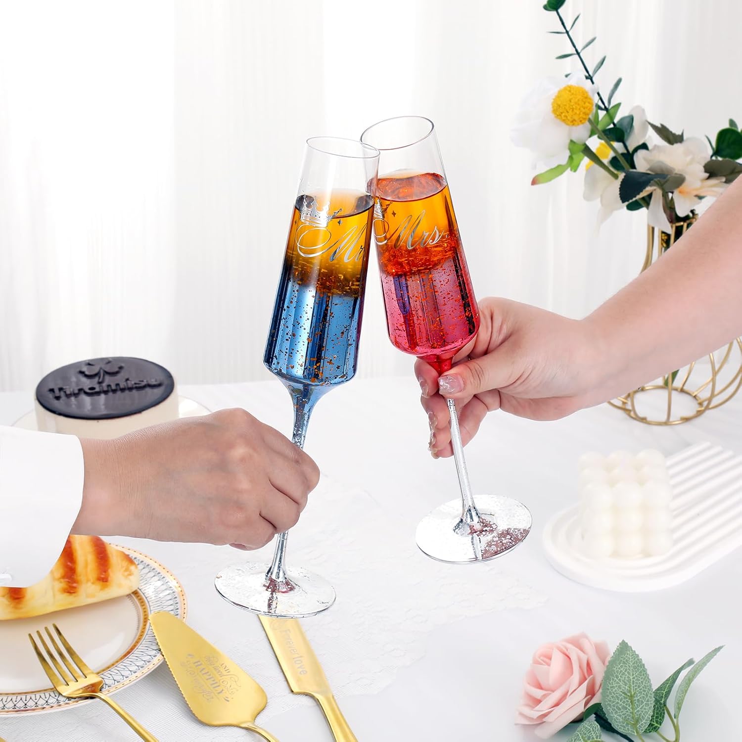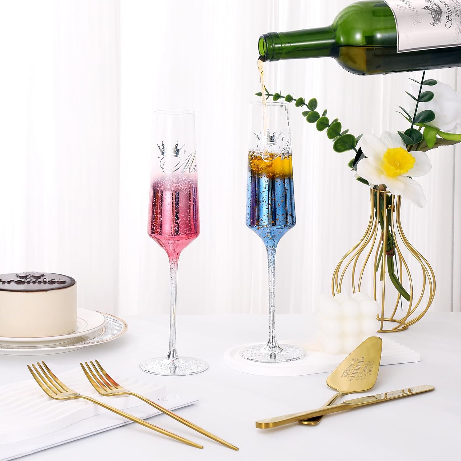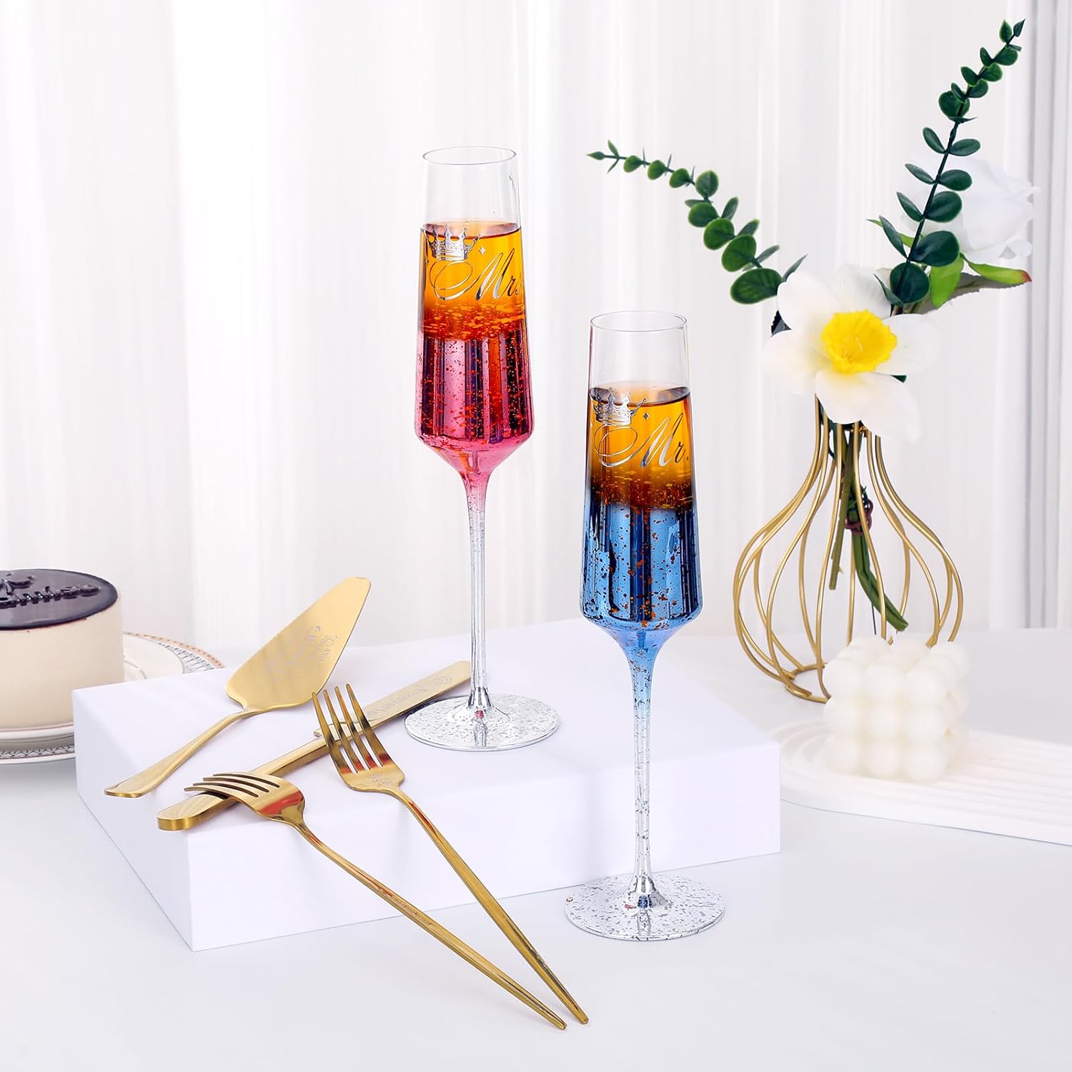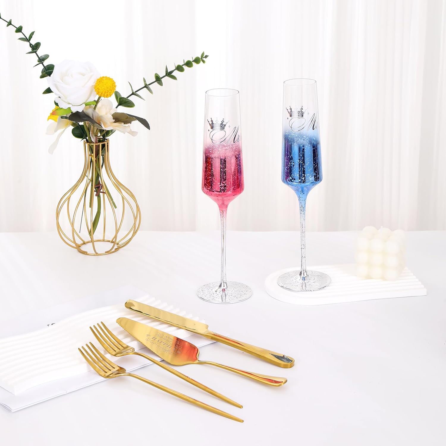 Wedding Cake Knife and Server Set, Mr and Mrs Champagne Flutes& Cake Cutting and Forks Set, Bridal Shower Gifts Wedding Anniversary Engagement Gifts for Bride and Groom