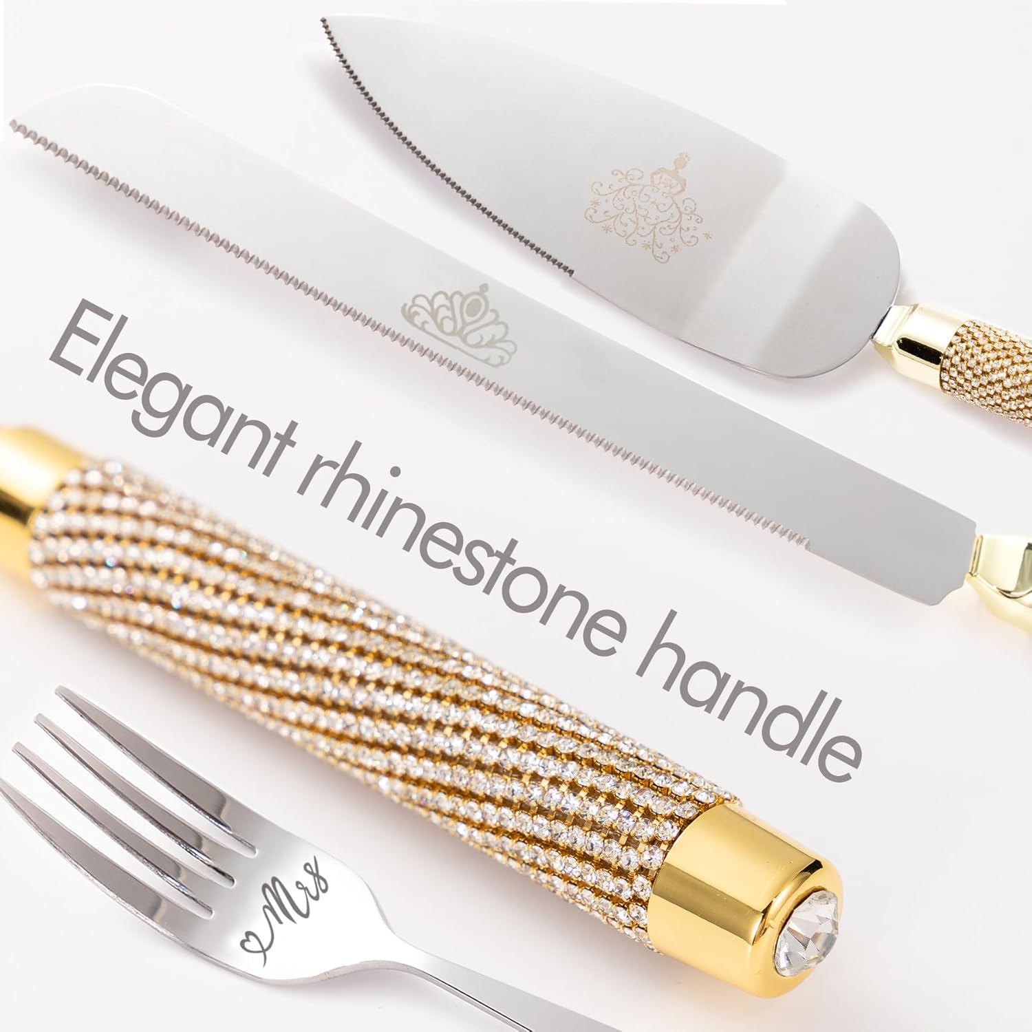 • Rhinestone Handle: This wedding cake knife and server set and cake forks are crafted from food grade stainless steel, The elegant rhinestones filled handle design adds a touch of glamour to any wedding celebration, great for mr and mrs gifts.