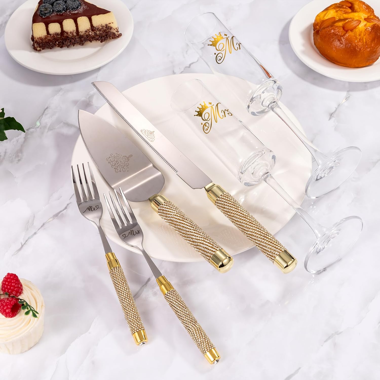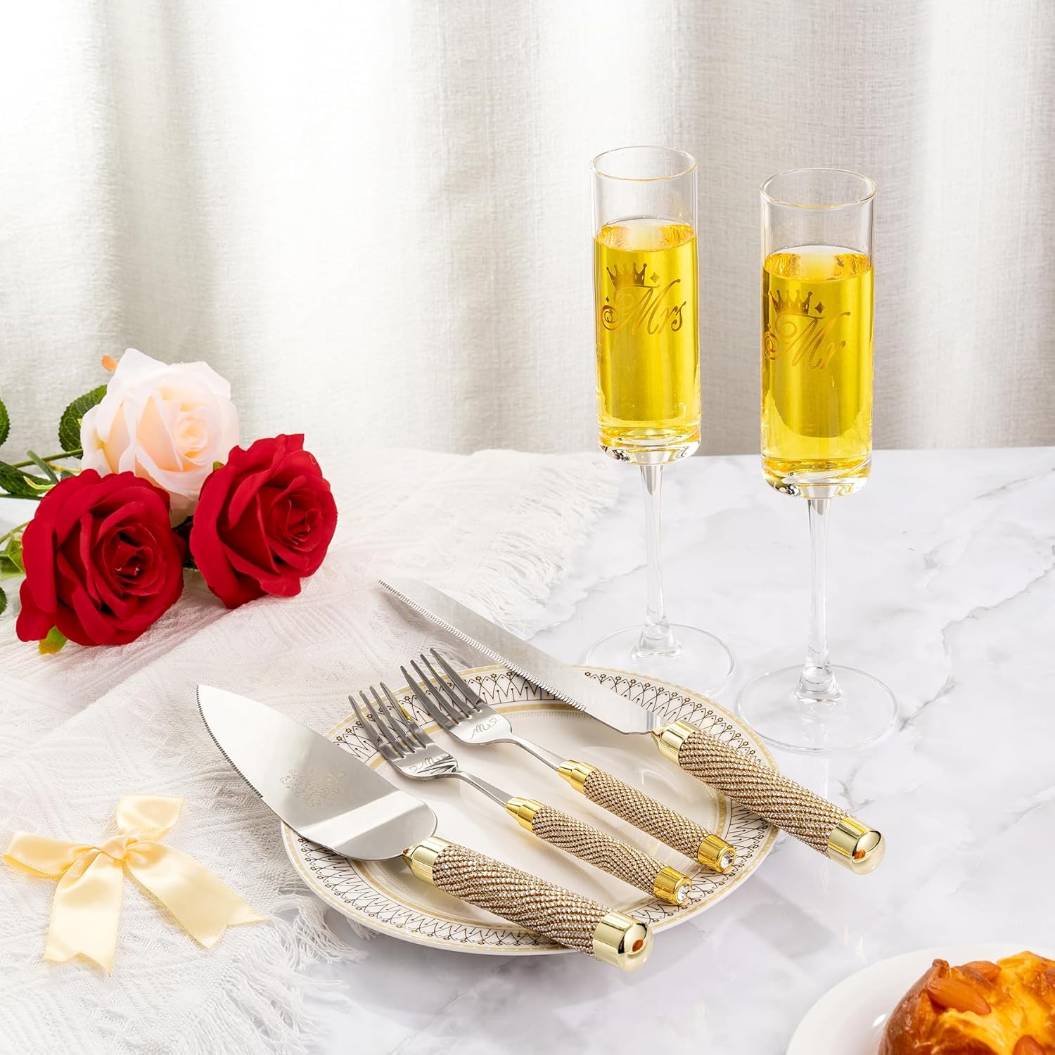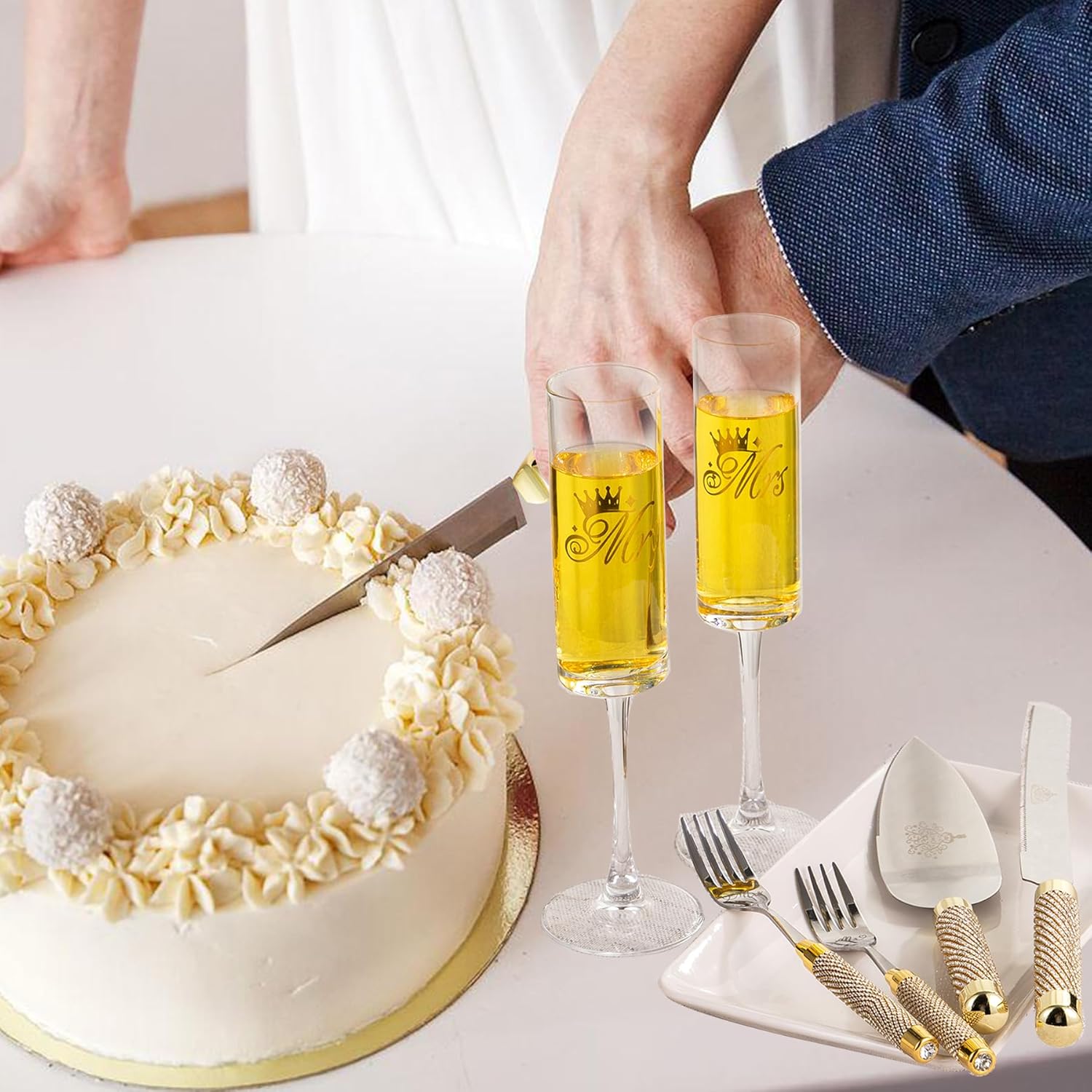 Wedding Champagne Flutes and Cake Knife Server Set, Gold Bride and Groom Champagne Glasses and Cake Cutting Set for Wedding Gifts 2024 (Gold)