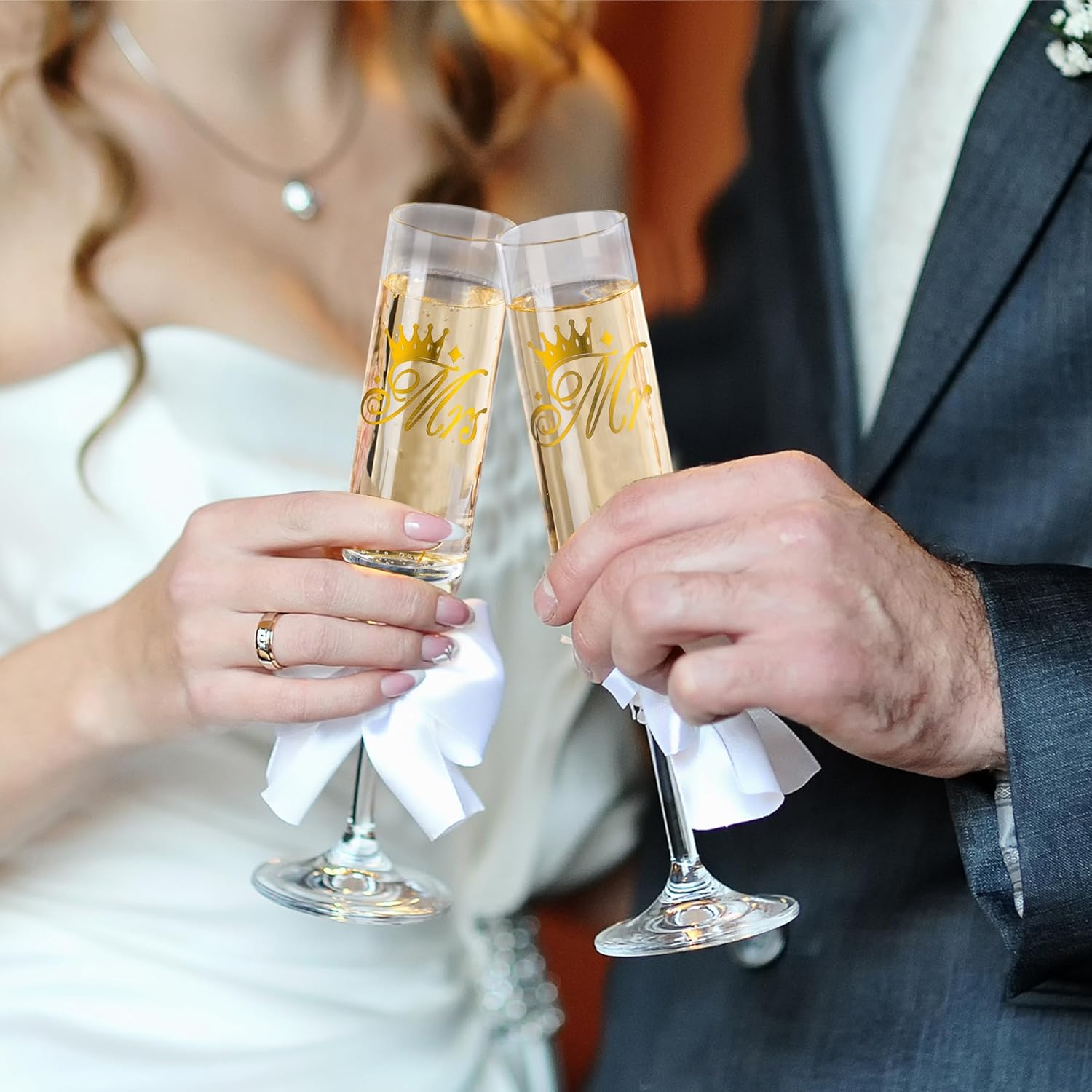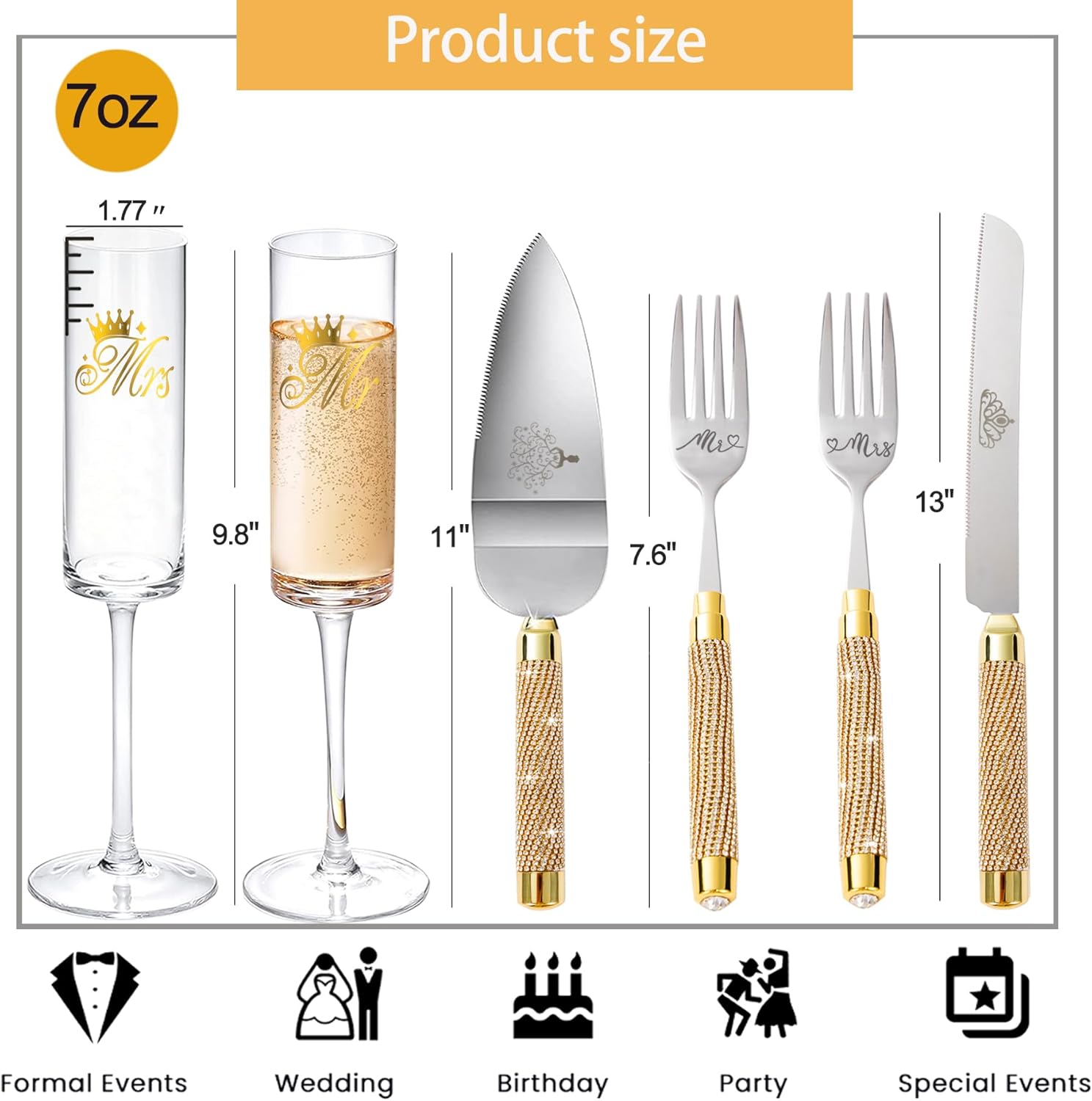 • Weddding Champagne Flutes and Cake Knife Server Set: Elevate your special moments with our Mr and Mrs champagne flutes. These remarkable bride and groom champagne glasses capture the essence of love and celebration, making them the great gift for engagements, weddings, and anniversaries.