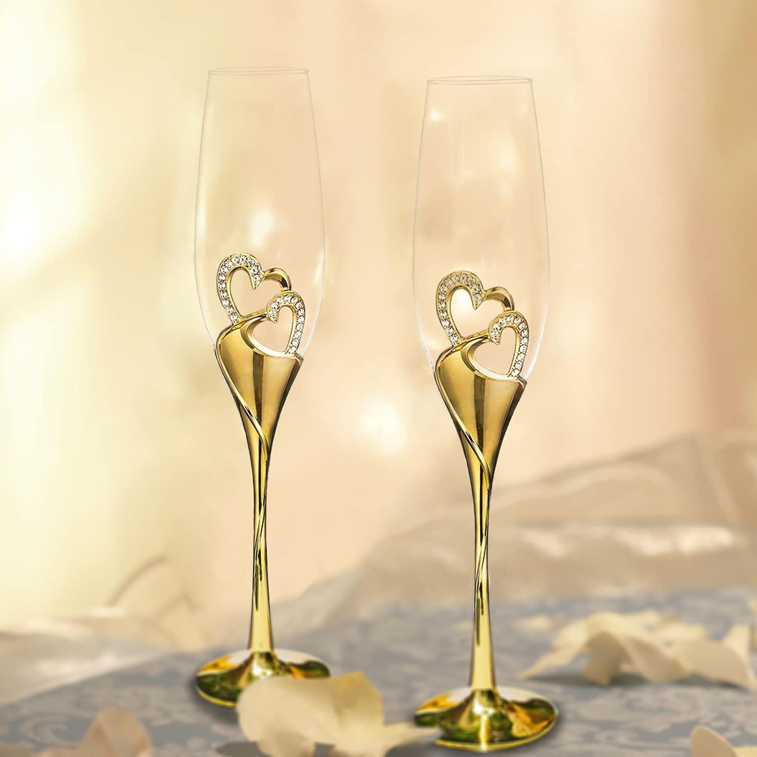 Wedding Champagne Glass Set Gold Toasting Flute Glasses Deluxe Pack of 2 with Rhinestone Rimmed Hearts Decoration for Wedding, Anniversary and Special Occasions