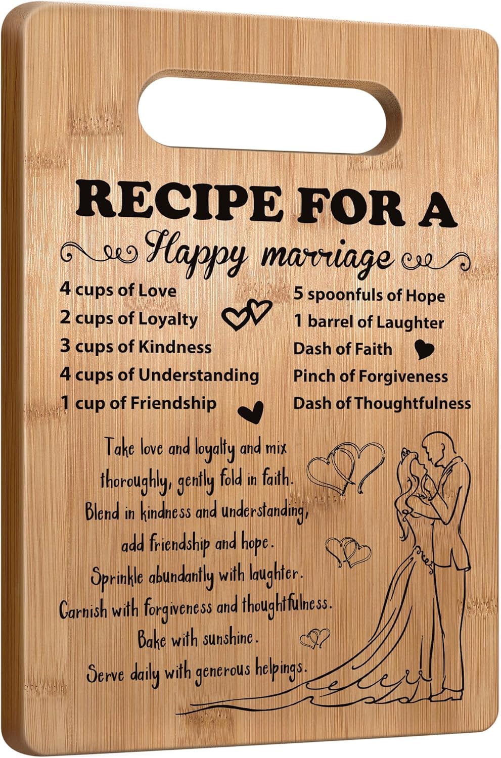 - 【Best Marriage Anniversary Engagement Gift】The classic perfect gift for the strongest couple you know! This design features “Recipe for a Happy Marriage”. Our cutting boards make a wonderful gift for newlyweds, wedding gift, engagement gift, anniversary, bridal shower, Valentine’s day.