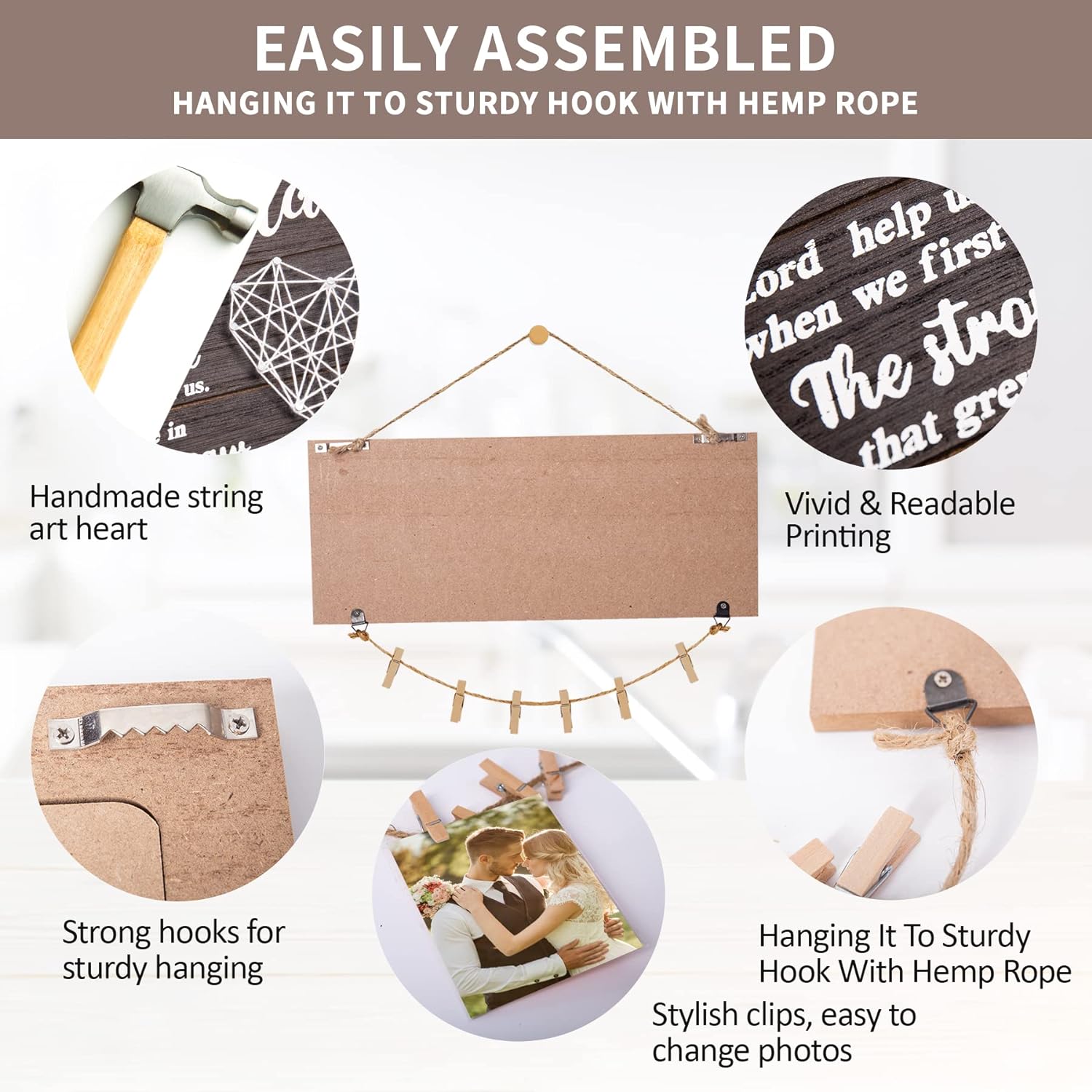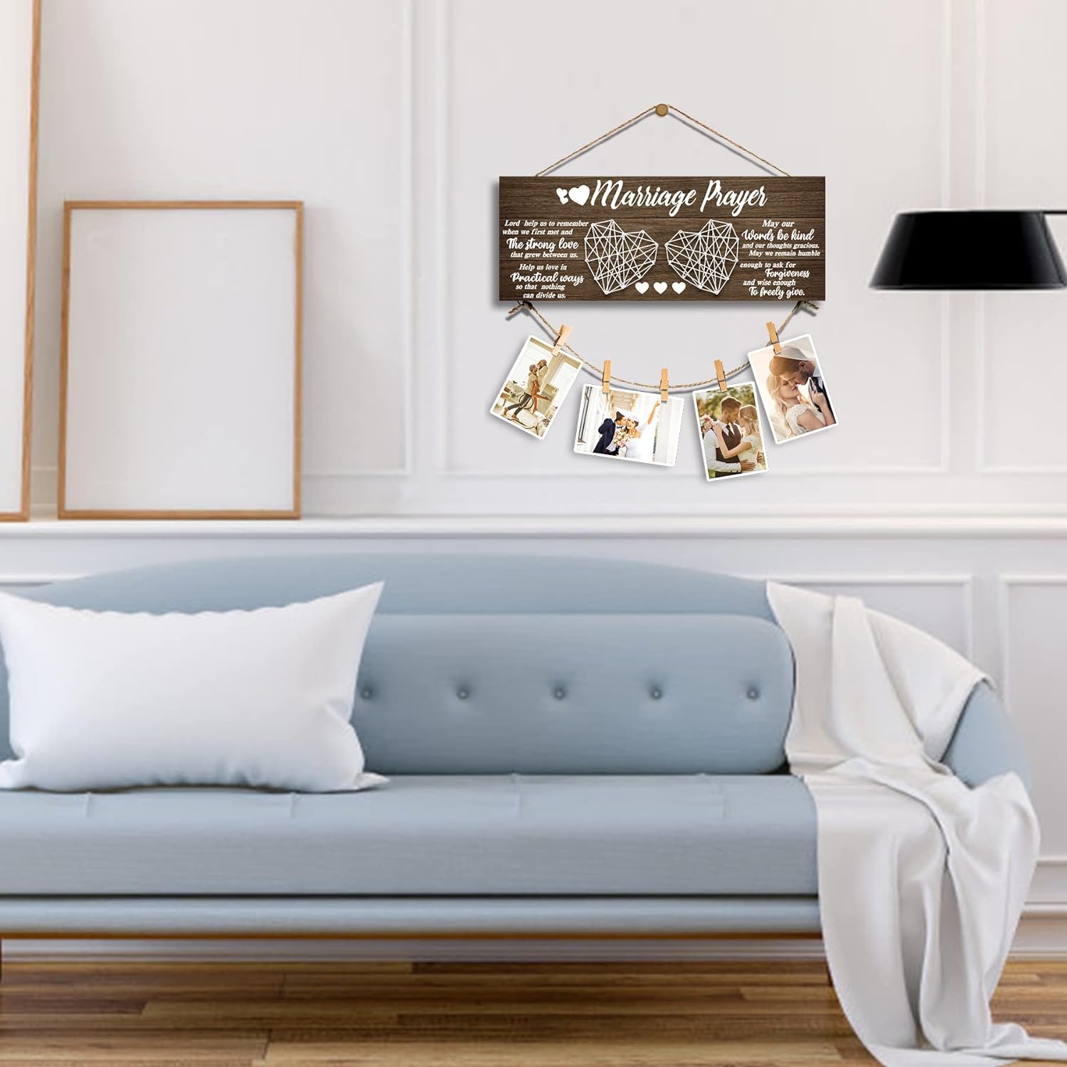 - 【PERFECT SIZE & EASY MOUNTING】: This Engagement gift photo holder measures about 15.7 x 5.9 inch, and come with 8 stylish wooden clips (3 for easy replacement) to hang and display couple photos, It will comfortably fit 4×6 inches and any smaller size photos. Come with 2 hemp ropes, back saw-tooth hangers and triangle hook , this couples picture frame gifts is easy to hang on the wall.