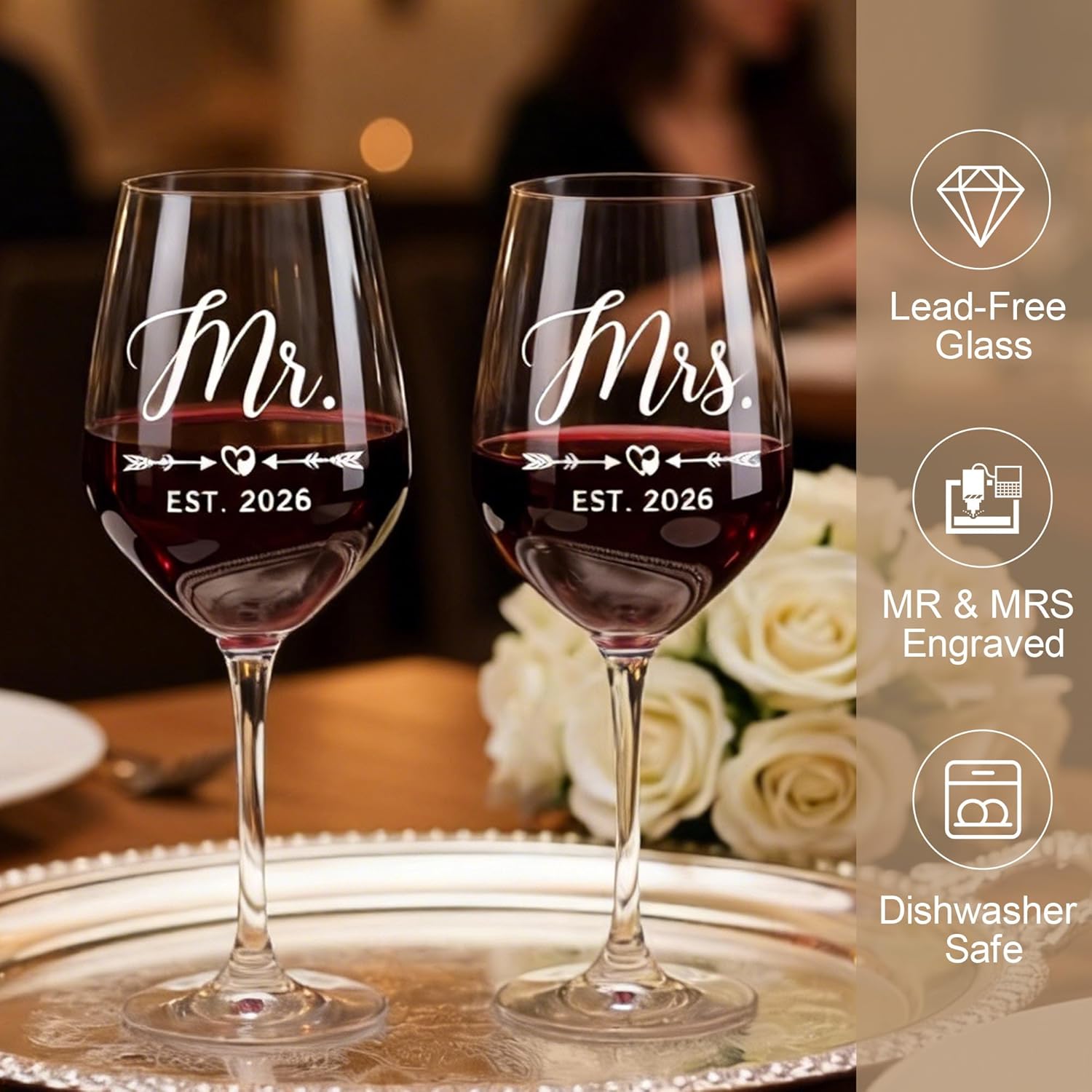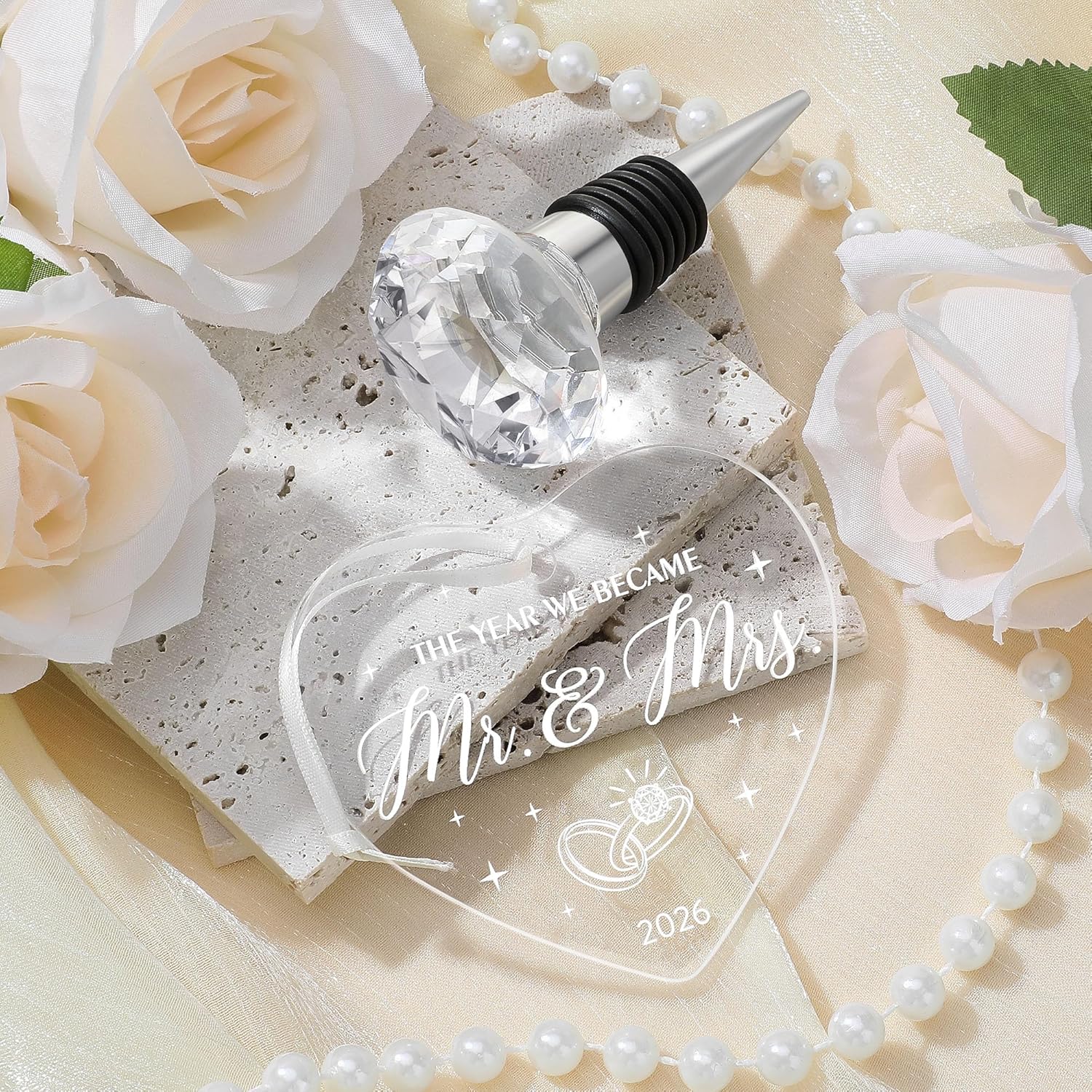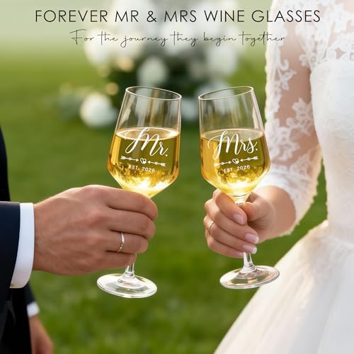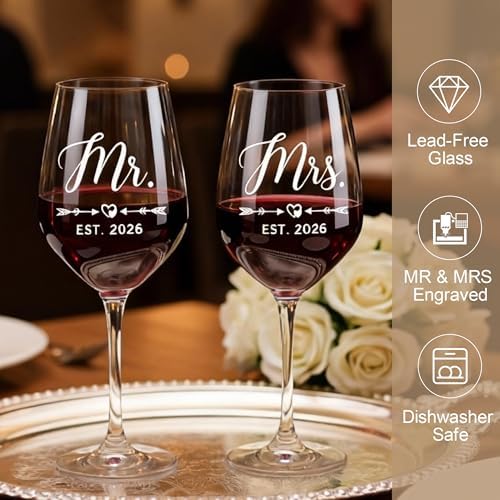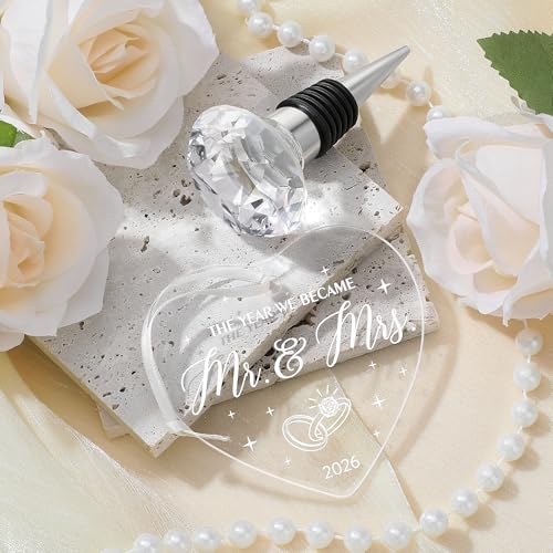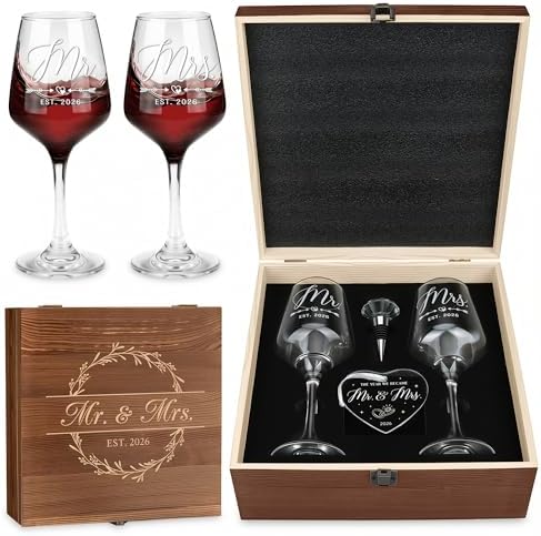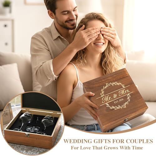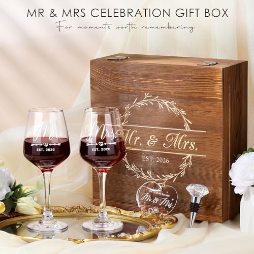 - Couples Gifts for Him and Her: Our thoughtfully curated bride to be gift set is designed to add sparkle to every romantic moment of hers. The married couple gift includes 5 items: 2 x mr and mrs glasses for wedding, 1 x diamond wine stopper, 1 x acrylic wedding ornament, and 1 x engraved wooden box. Ideal as wedding shower gifts, each piece symbolizes a heartfelt wish for their shared future.