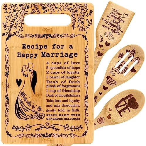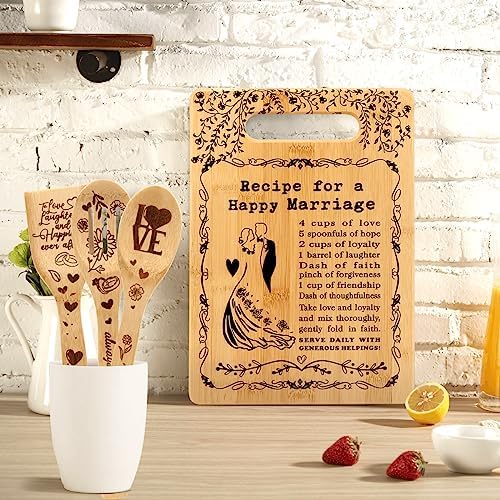 - 【 Best Wedding Gifts】 Our bamboo cutting board gifts are theme ”Recipe for a happy marriage”, and salad spoon, Spatula, and slotted Spatula are engraved with many sweet & warm words such as [LOVE], [to love laughter and happily ever after], [always better together], she will feel your love and wish through the warm words. Handle Design, which can hang the chopping boards on the RV, camp wall, and easy to carry when outside picnic. It is both thoughtful and practical.