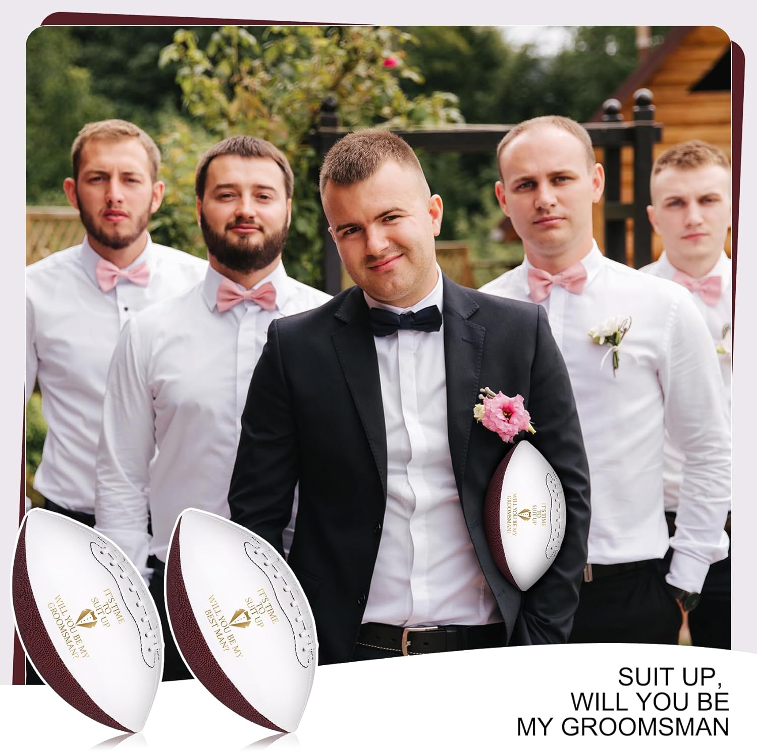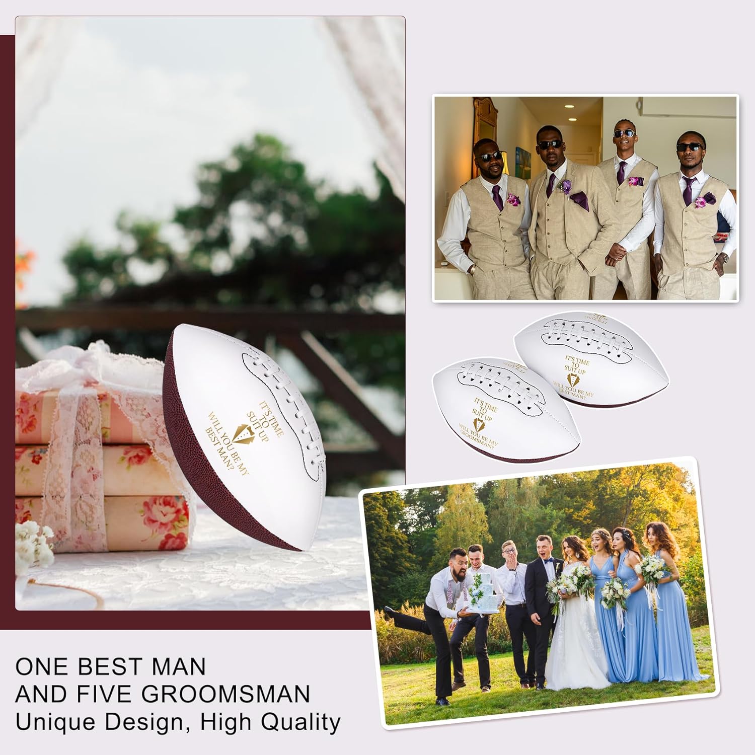 • Designed for wedding celebrations: These wedding groomsmen footballs are creative with customized wedding themes, uniquely designed, and printed with humorous invitations [It’s time to suit up! Will you be my groomsman]; enhance the wedding atmosphere, and leave an unforgettable surprise for the best man and groomsmen.