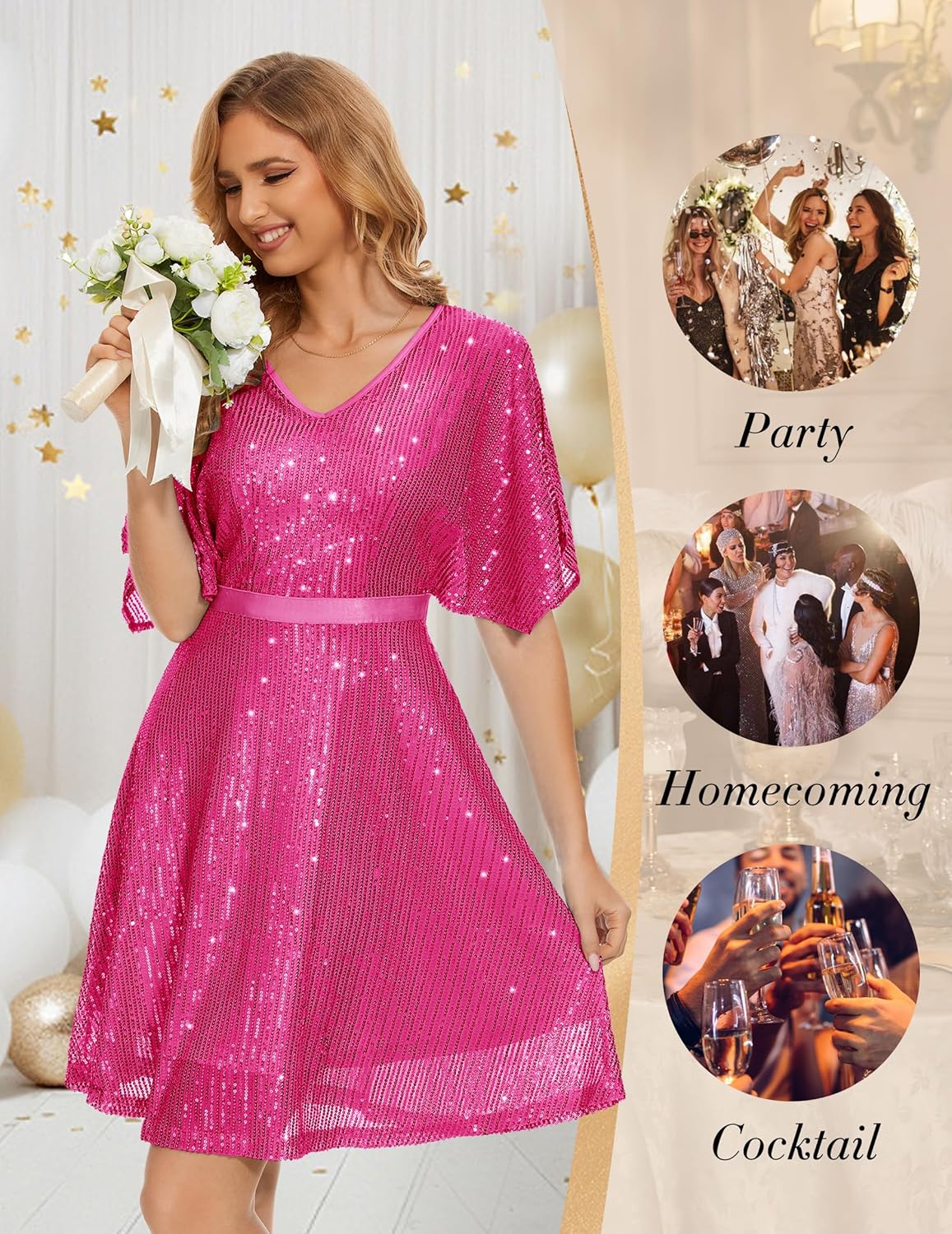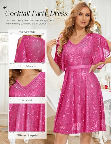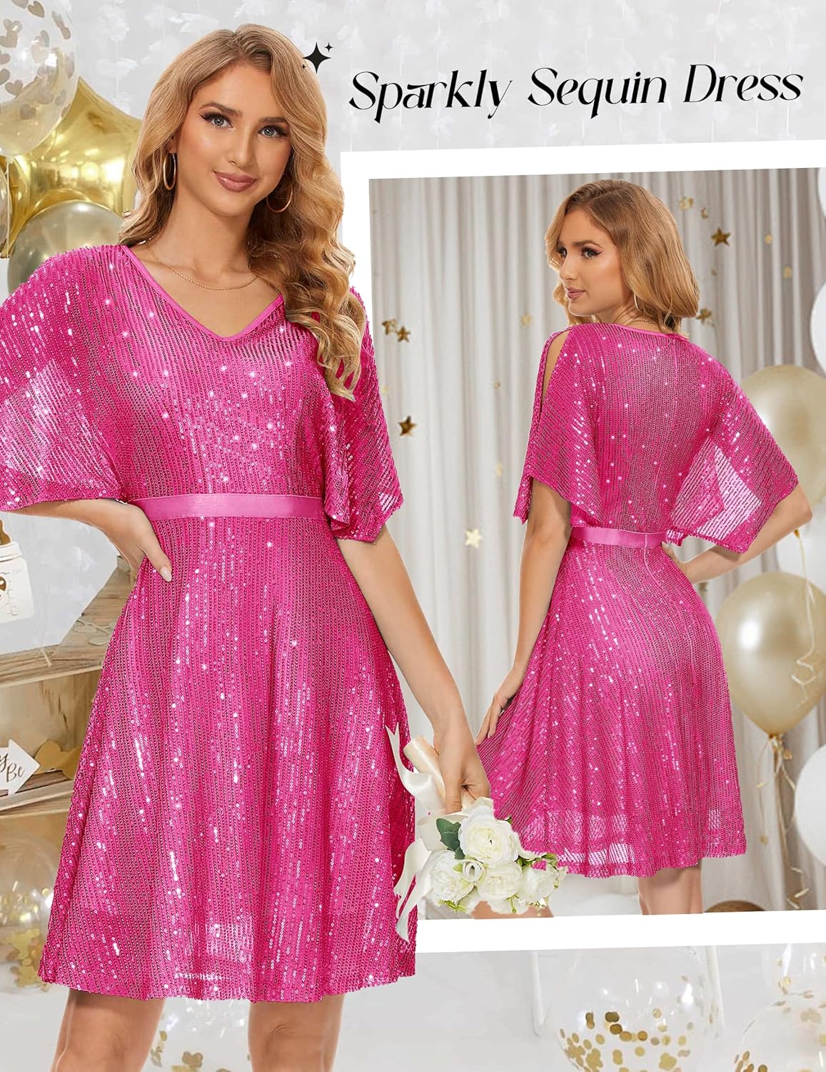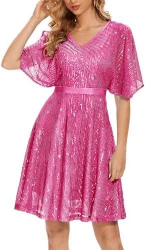 • 【Sparkly Sequin Dress】Bat Sleeves, Glitter Sequin, V Neck, Hidden Zipper, Knee Length. Sparkling sequins dress designed with flutter sleeves, which enhances your arms and flatters your figure. Undetachable satin belt and high waist modified your waistline, showing your unique glamour.