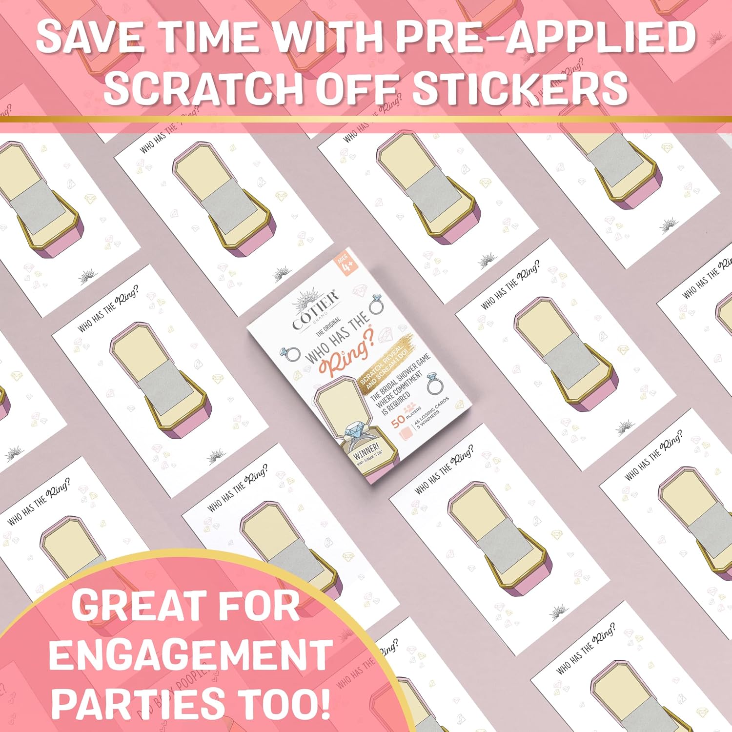 - HILARIOUS BRIDAL SHOWER GAME: Scratch, reveal and scream “I DO!” Each set includes 50 lottery scratch off cards including 45 losing cards and 5 winners. The stickers are pre-applied, so all you’ll have to do is open the deck and hand the cards out at your event! The winners are separated in clearly marked packaging in the pack so that you have full control over how many winners there are per round. Mix them into the deck for randomized winners or fix the results. Totally up to you!