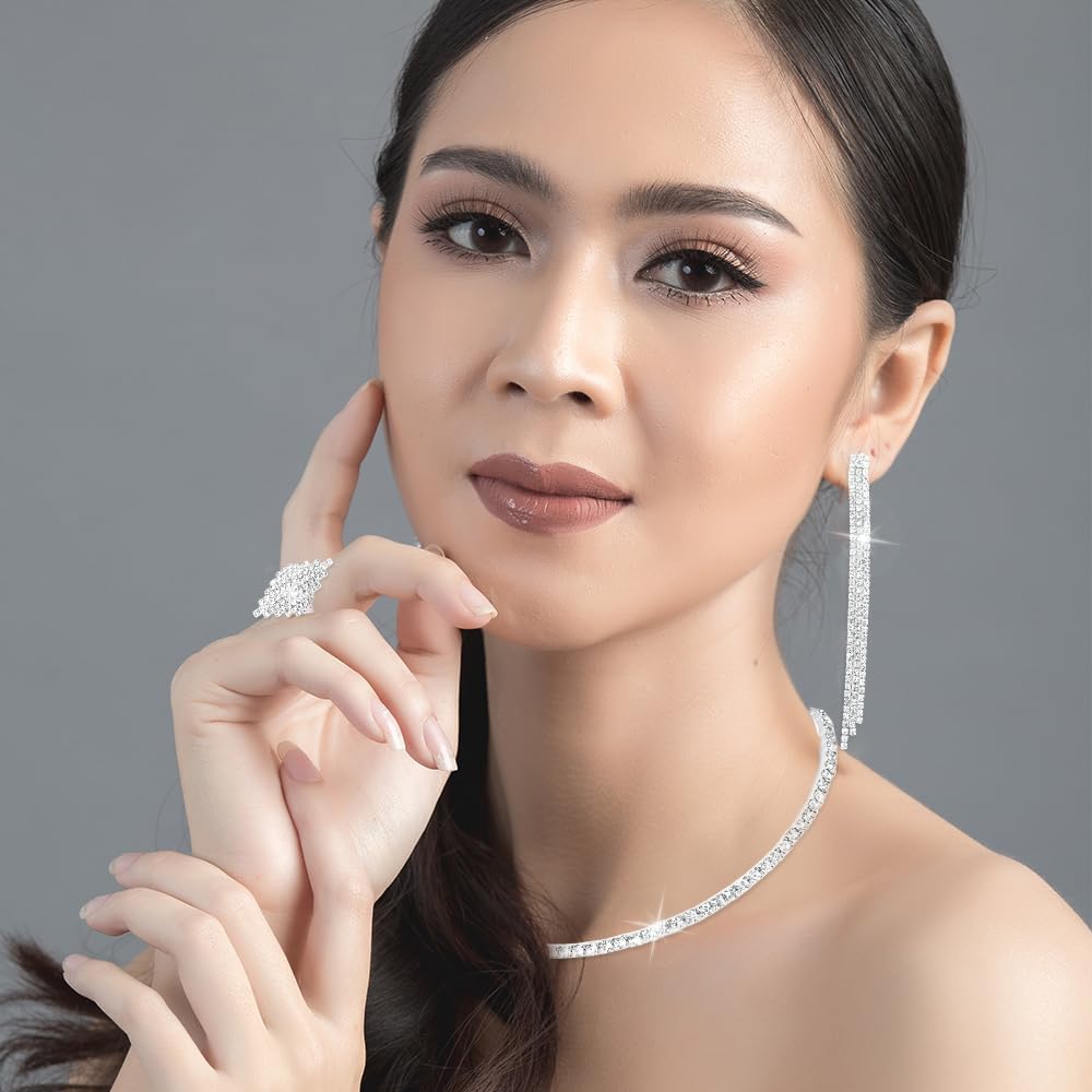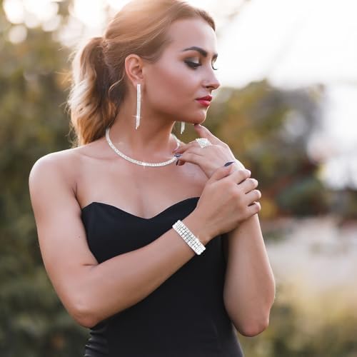 - Women Rhinestone Jewelry Set : The jewelry of necklace bracelet earring and ring are made of quality alloy material and shiny rhinestones, not easy to damage or fade, give you a long lasting finish, and will not irritate the skin