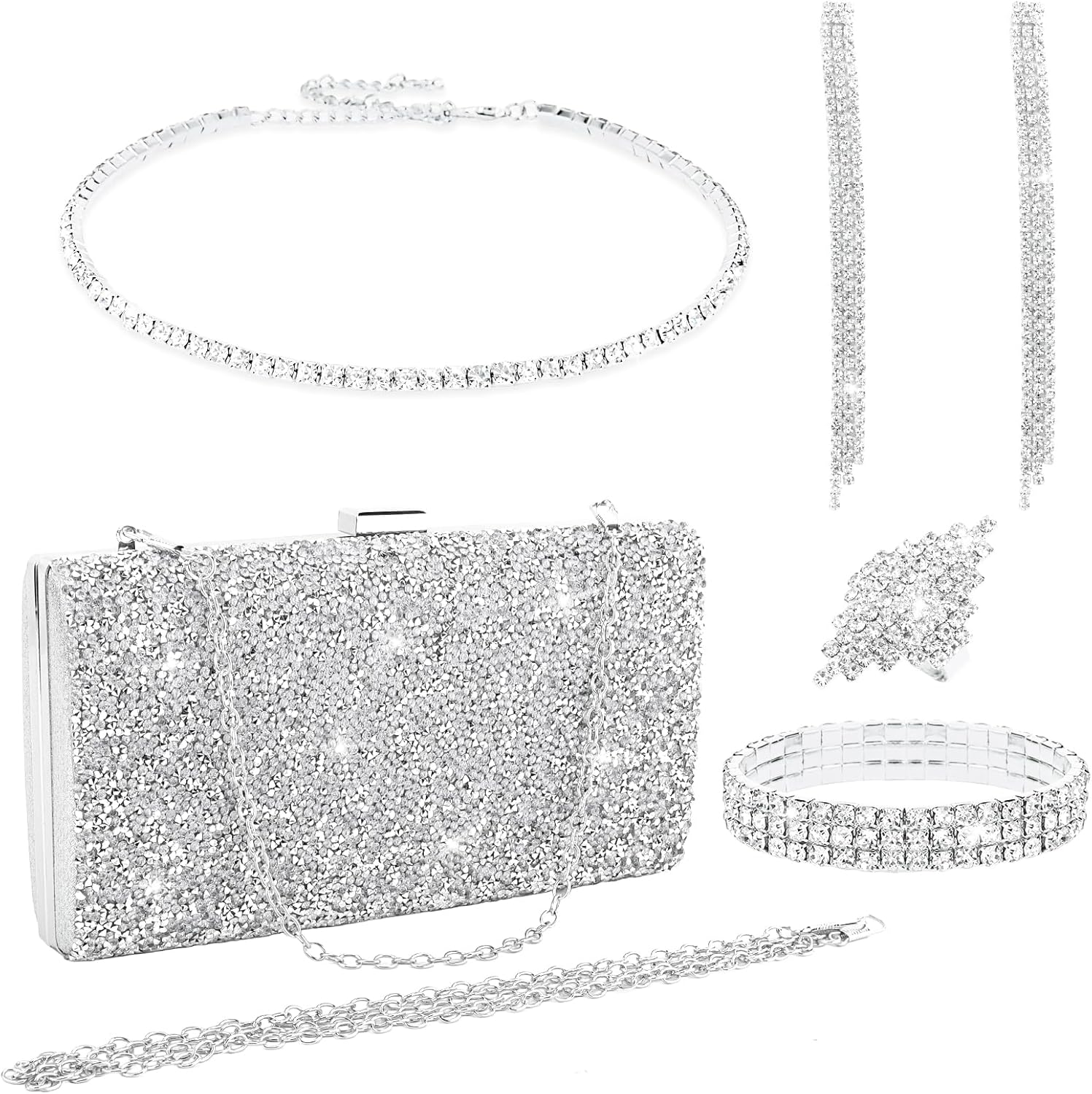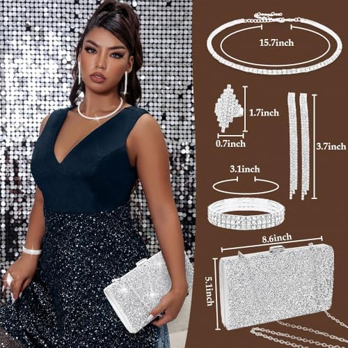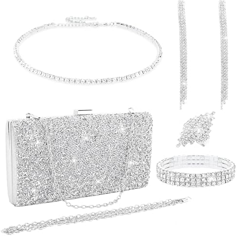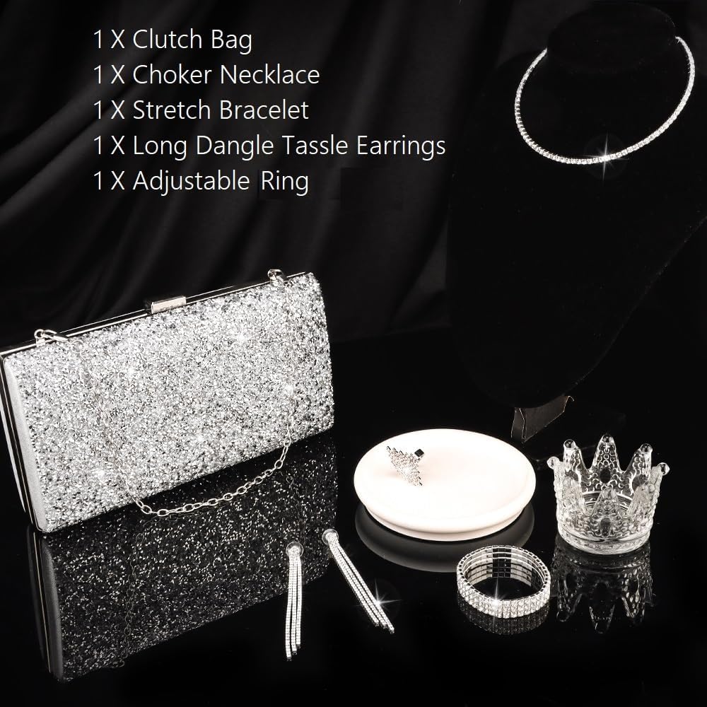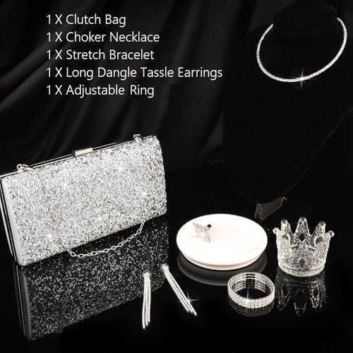 - Silver Jewelry Set :These Jewelry Set includes 1 piece of silver clutch purse, 1 piece of choker necklace, 1 pair of tassel earrings, 1 piece of stretch bracelet, and 1 piece of adjustable ring. All of these jewelry set are enough for you to match diversified evening dresses or other formal outfits. Shiny elegant design always keep you fashionable and make you look more gorgeous