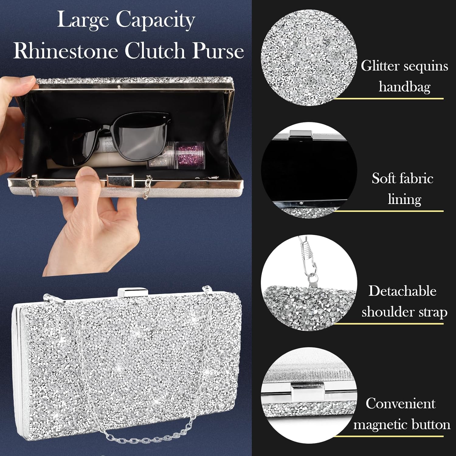 - Women Shiny Clutch Purse : The clutch purse is mainly made of polyester lining, with some shiny glitter rhinestones and shiny fabric material, soft and smooth inner material made of satin fabric will not scratch the inner items; coming with a detachable chain, inside has a main compartment offering enough space to hold essential items like cell phones, cards, compact mirror, lip gloss, powder, keys and etc