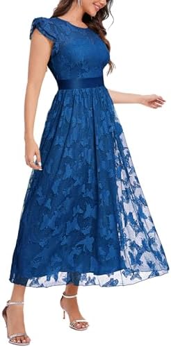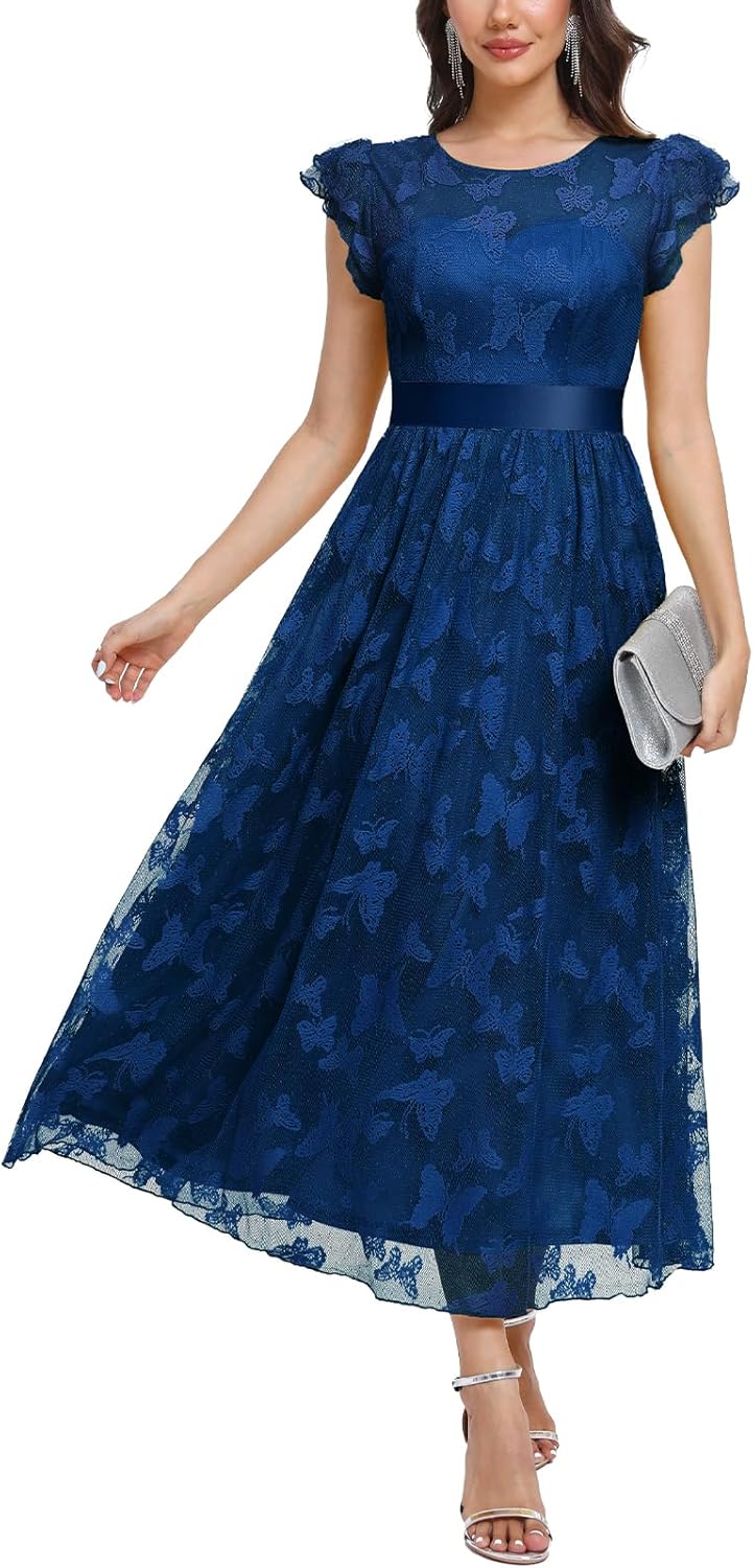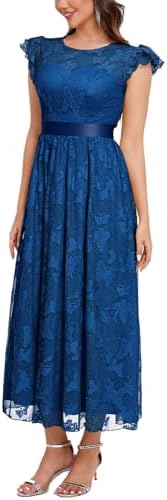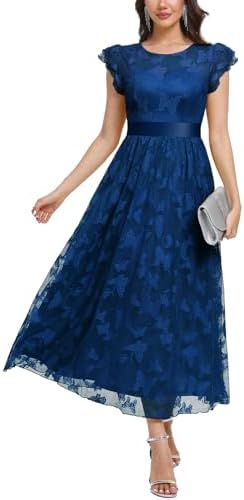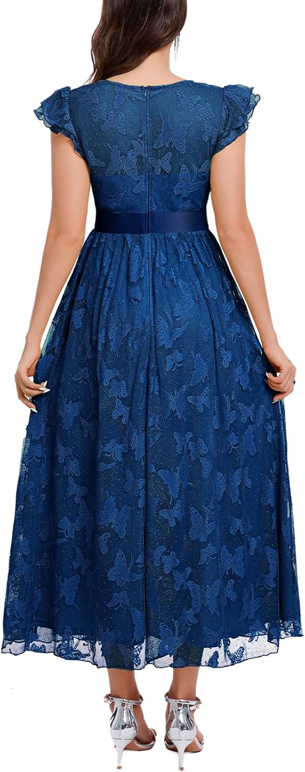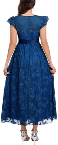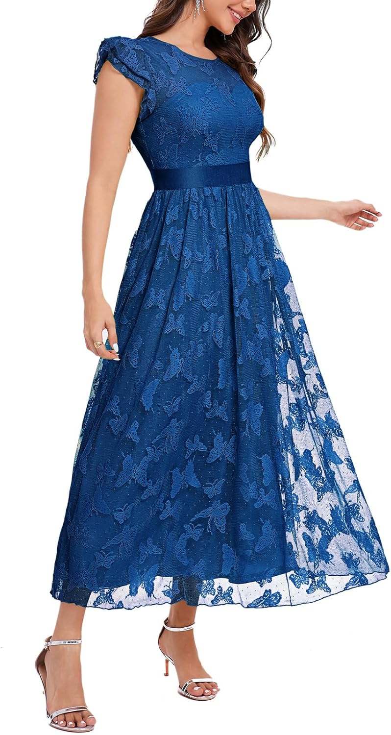 Womens Casual Tulle Midi Dress Ruffle Sleeve Crewneck Lace Flowy Dresses Party Wedding Guest Sundress
