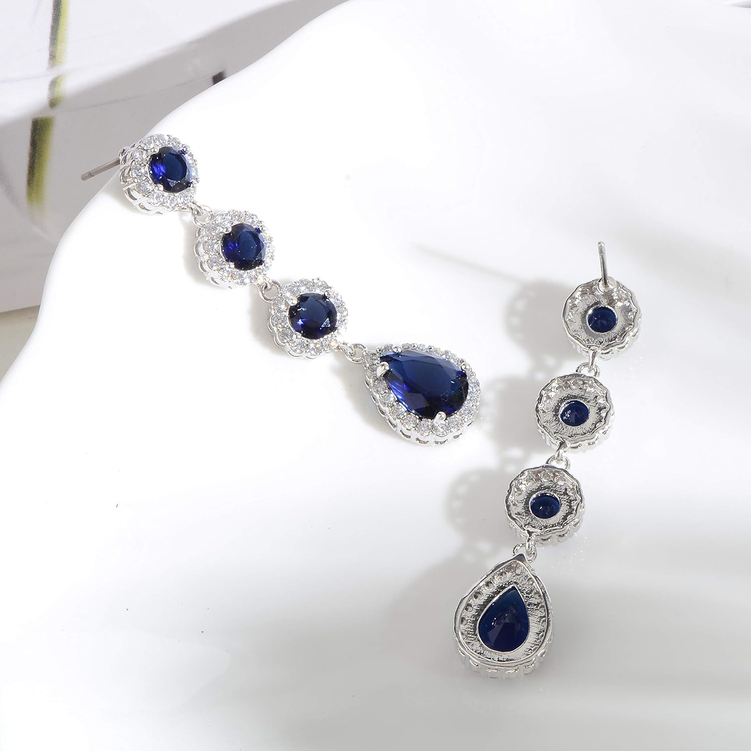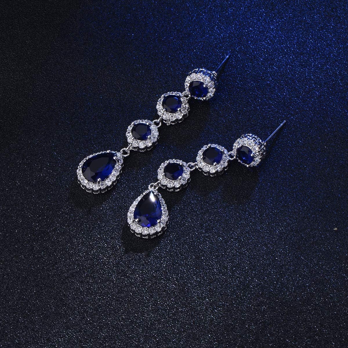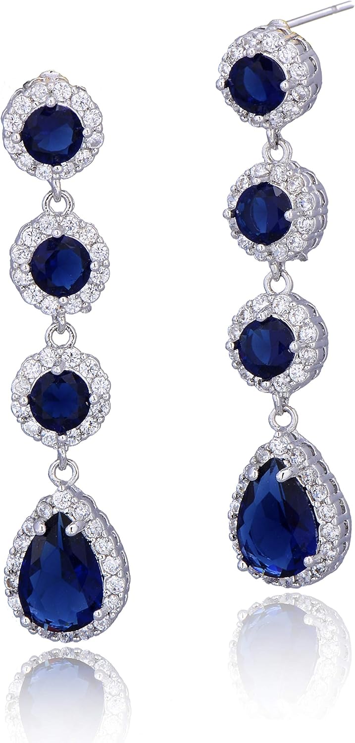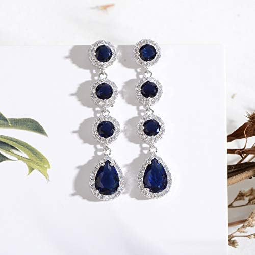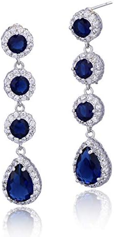 - UNIQUE DESIGN – Silver long Blue Sapphire CZ linear dangle drop earrings featuring 14k white gold plated with grade AAAAA round teardrop Cubic Zirconia crystals for a diamond-like brilliance. Crafted from high-quality copper. These long luxurious statement earrings are sure to catch everyone’s eyes wherever you go!