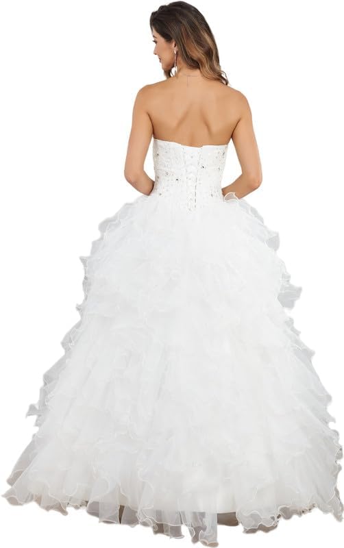 Womens Elegant Strapless Wedding Dress, Lace, Sweetheart Neckline, Beaded Bodice, Ruffled Tulle Ball Gown