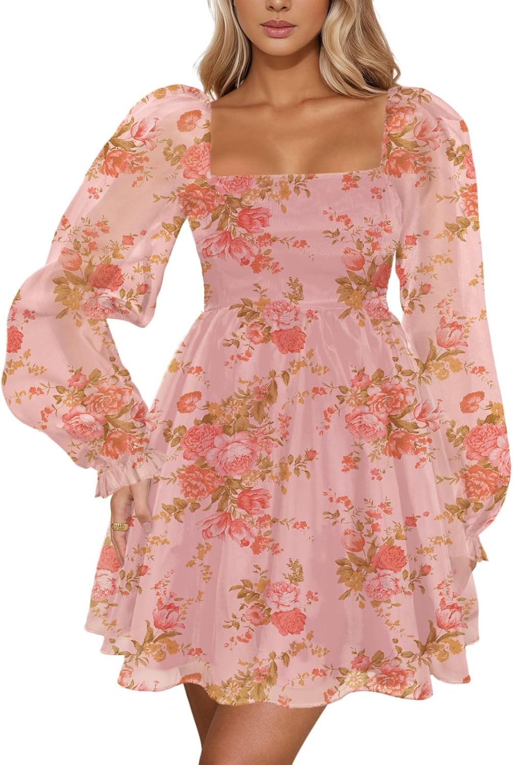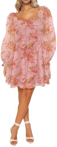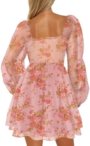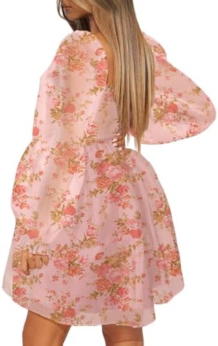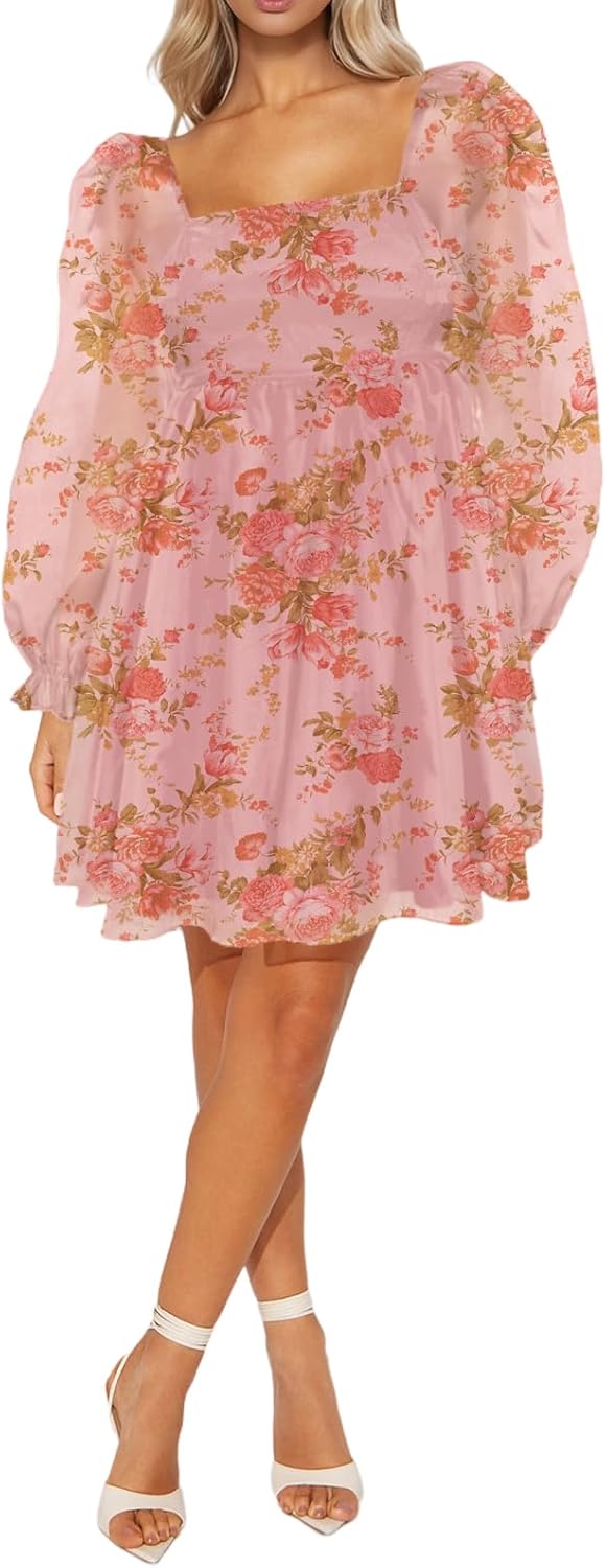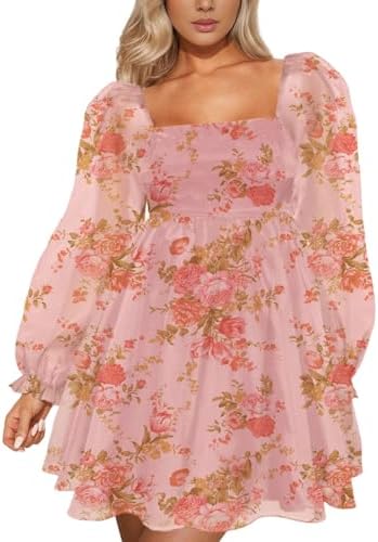 Oumrdeo Womens Floral Mini Dress Long Sleeve Square Neck Babydoll Casual A-Line Flowy Short Dress