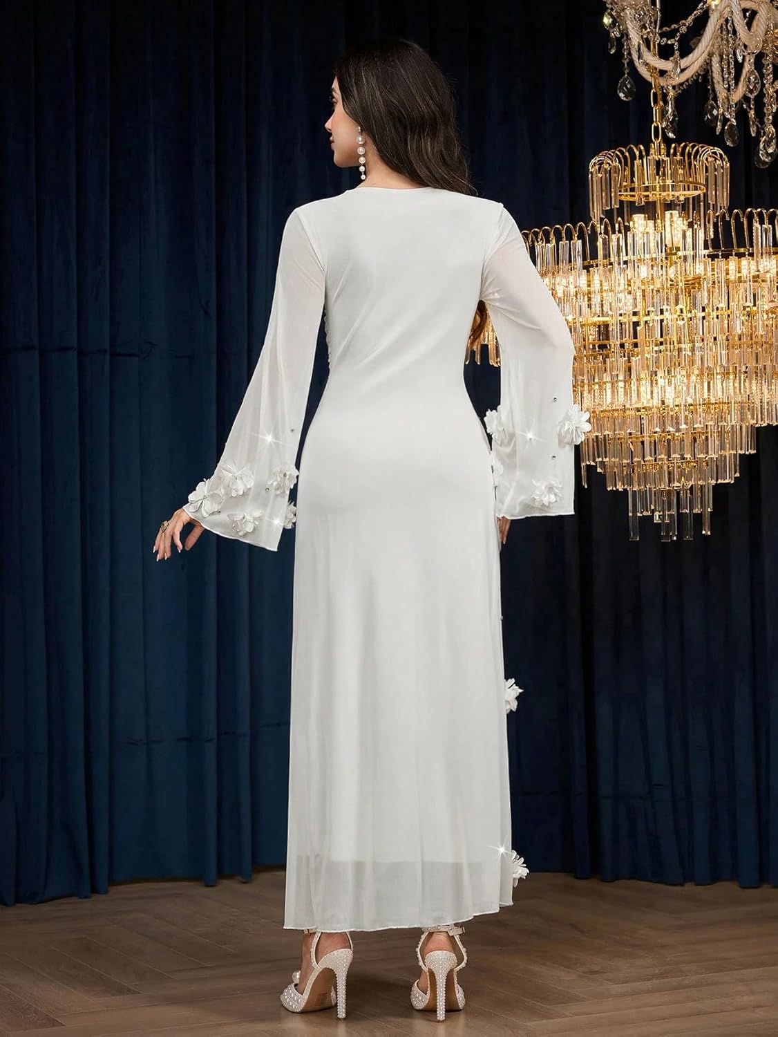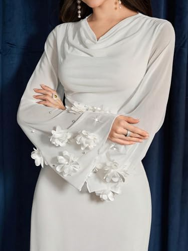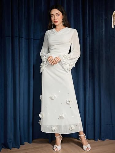 - Elegant wedding guest dress designed for formal occasions, featuring a long sleeve maxi silhouette with delicate lace and floral details for a sophisticated look.