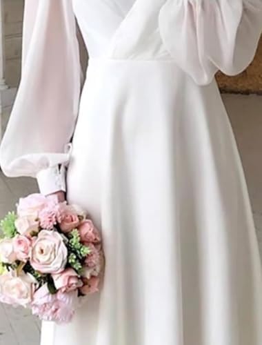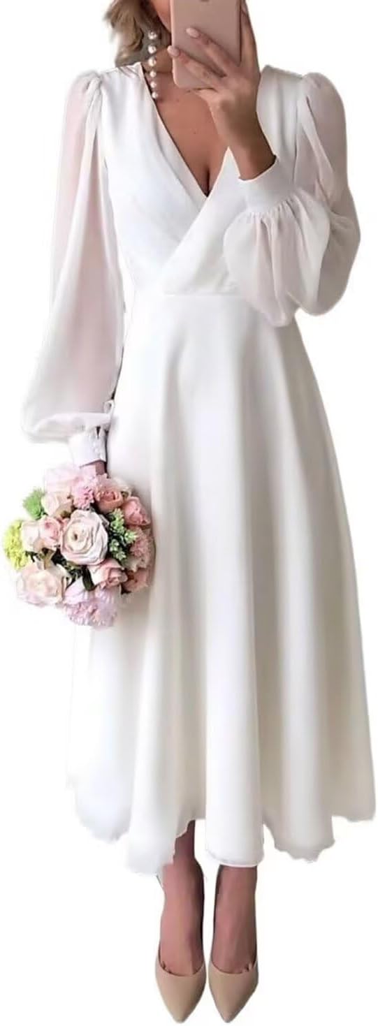 - Unique Features: soft chiffon formal dress for bride,simple weddig dress for bride,chiffon Tea Length wedding dress with sleeves,long sleeves dressfor bride,bride after wedding party dress,puffy long sleeves wedding gowns.deep v neck Tea Length dress for bride, knee lenght bridal dress for women,short engagement party dresses for bride, elopement dresses for bride,back zipper ,built in bra,a line,sexy v neck,create the most beautiful look
