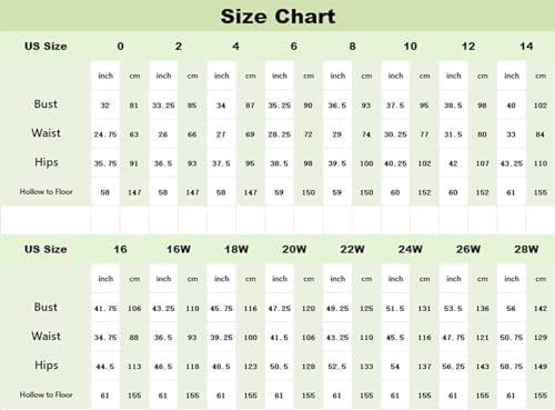 - Size: please refer to the size chart on the left, custom Service is also available. Please provide us your measurements of the Bust, waist, hips and hollow to floor when you place the order