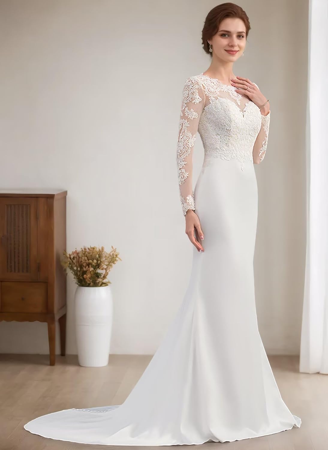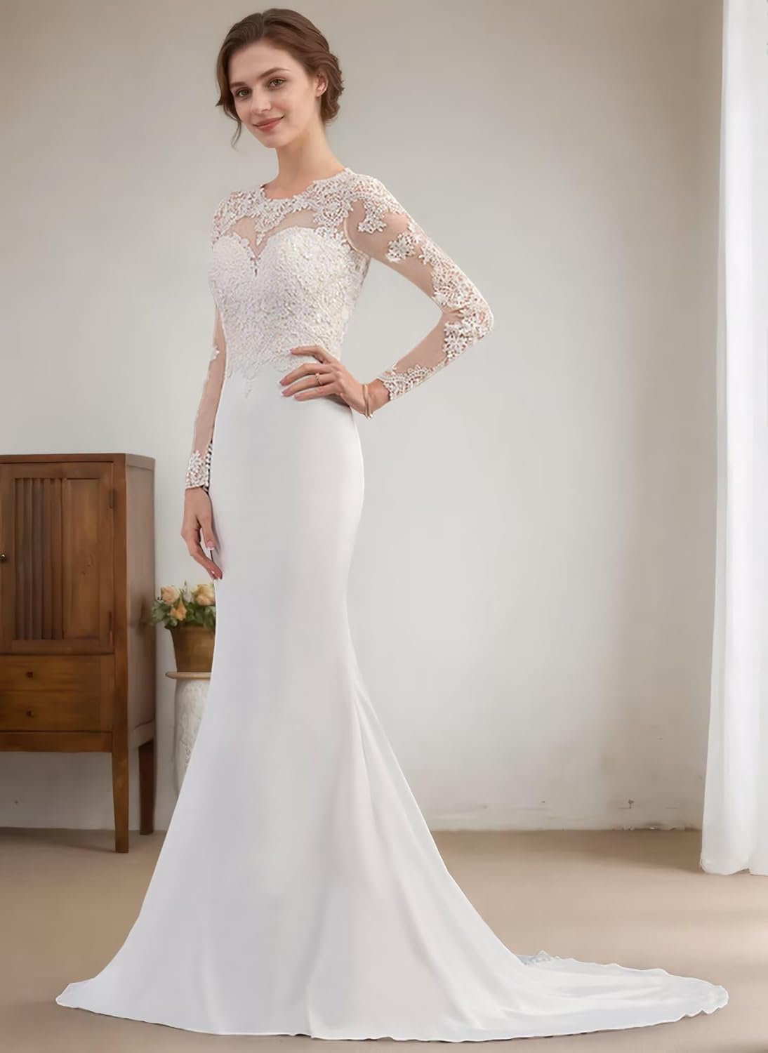 - Style/Feature: The lace Applique satin mermaid formal bridal dresses with sleeves cover multiple classical styles and features: mermaid,long sleeve,long train,lace applique satin fabric etc.