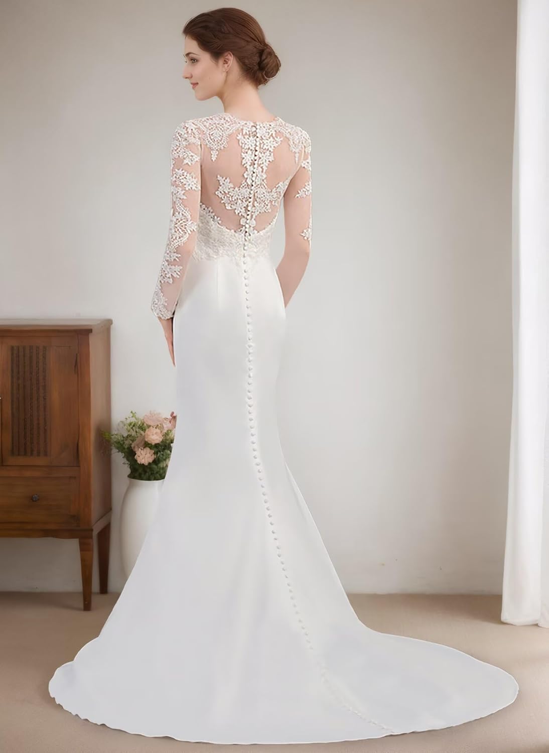 - Material: This mermaid long sleeve lace satin formal bridal wedding dresses for women bride are made of high quality satin and lace appliques fabric. The material is soft and comfortable to the Bride’s skin and the new style is fashionable.