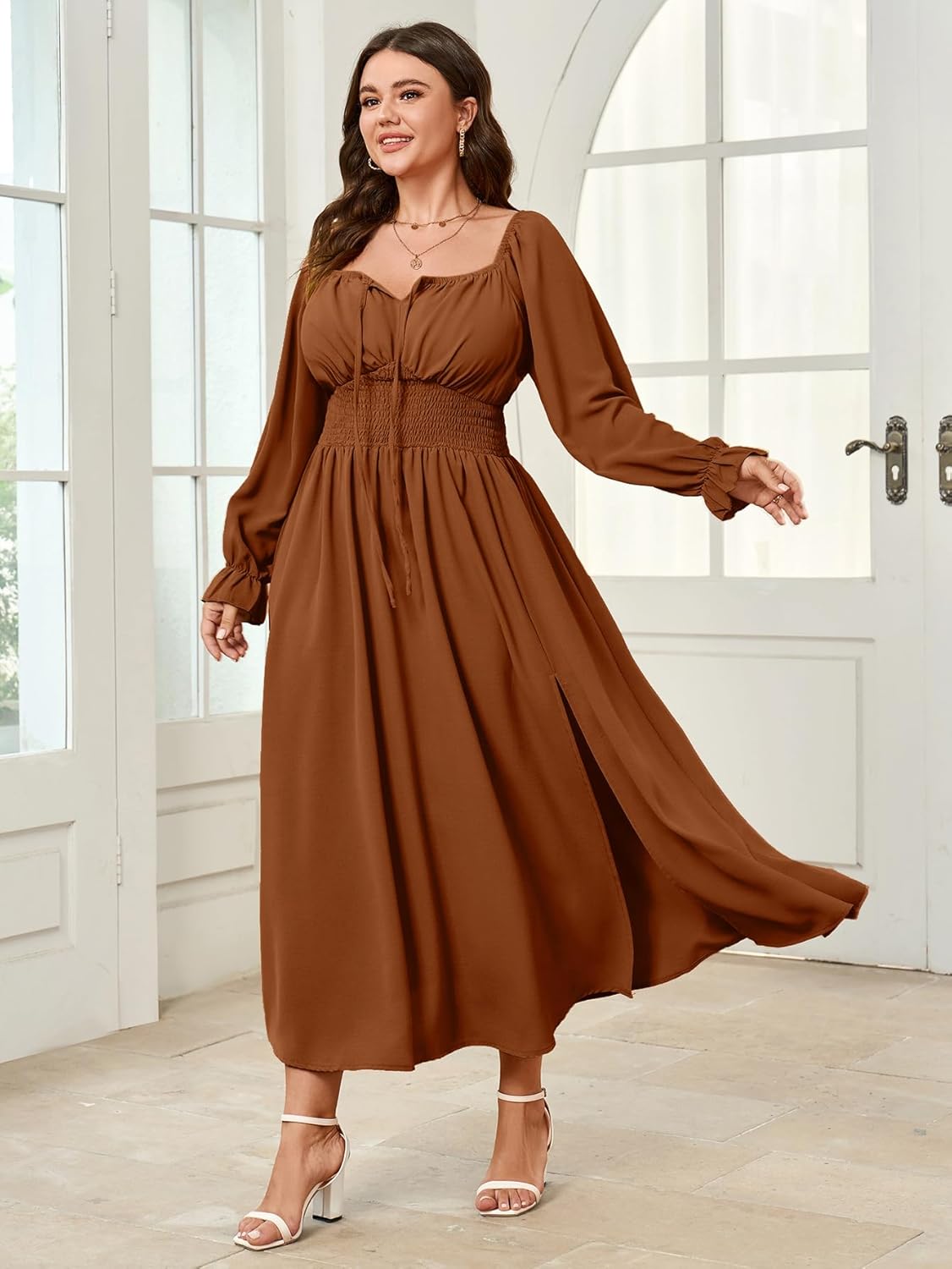Womens Plus Size Dress Long Sleeve Smocked Dress Square Neck Tie Front Split A-Line Maxi Long Dresses