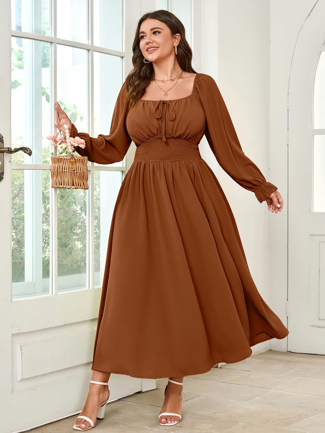 Plus Size Long Sleeve Maxi Dress for Women with Square Neck and Front Tie