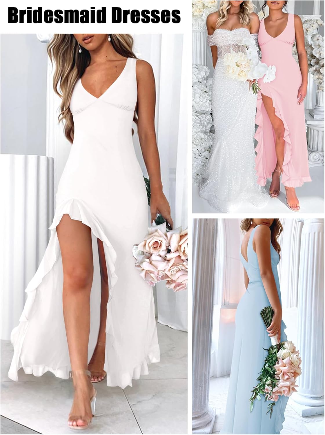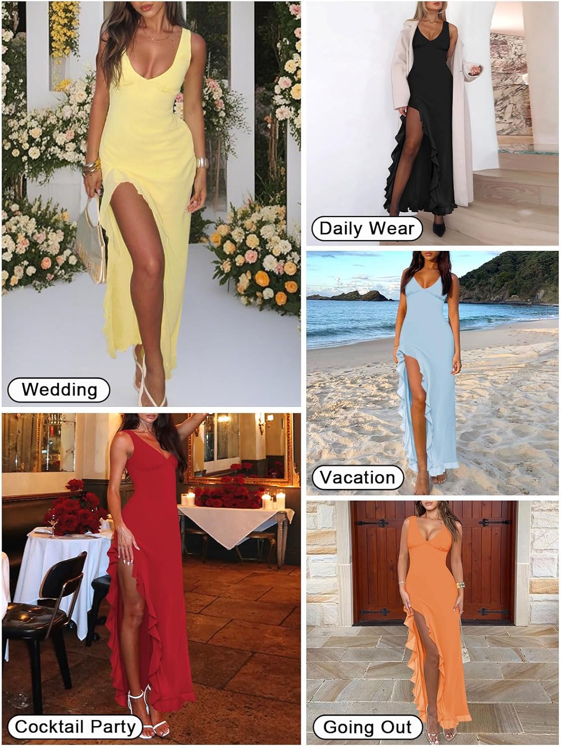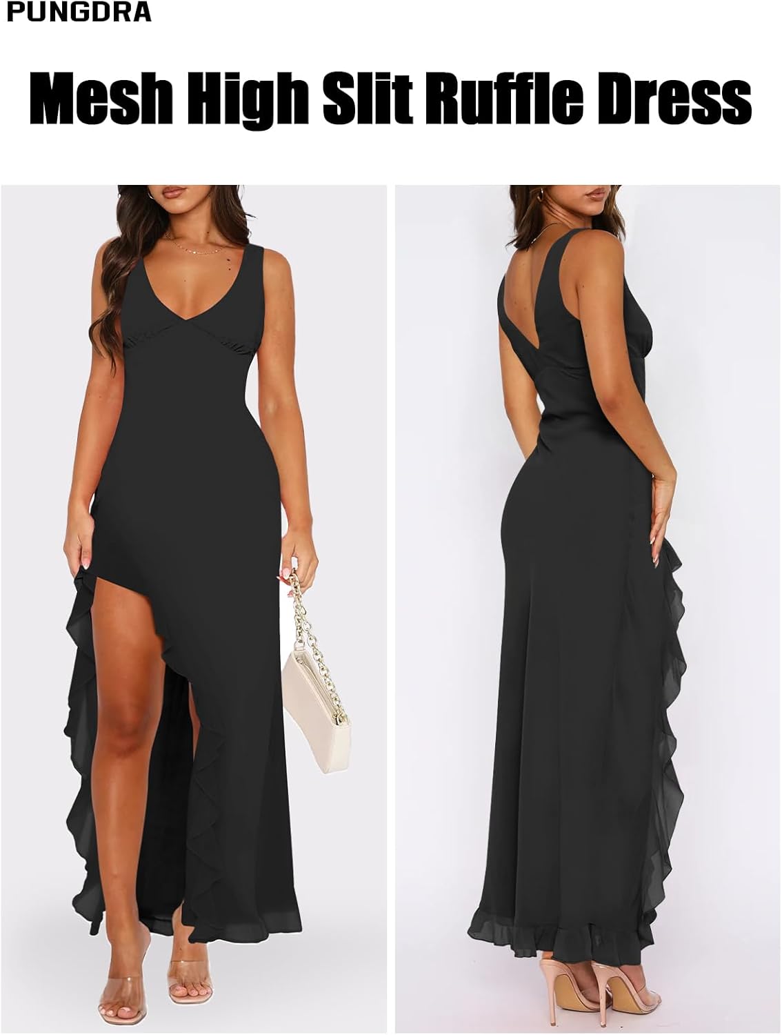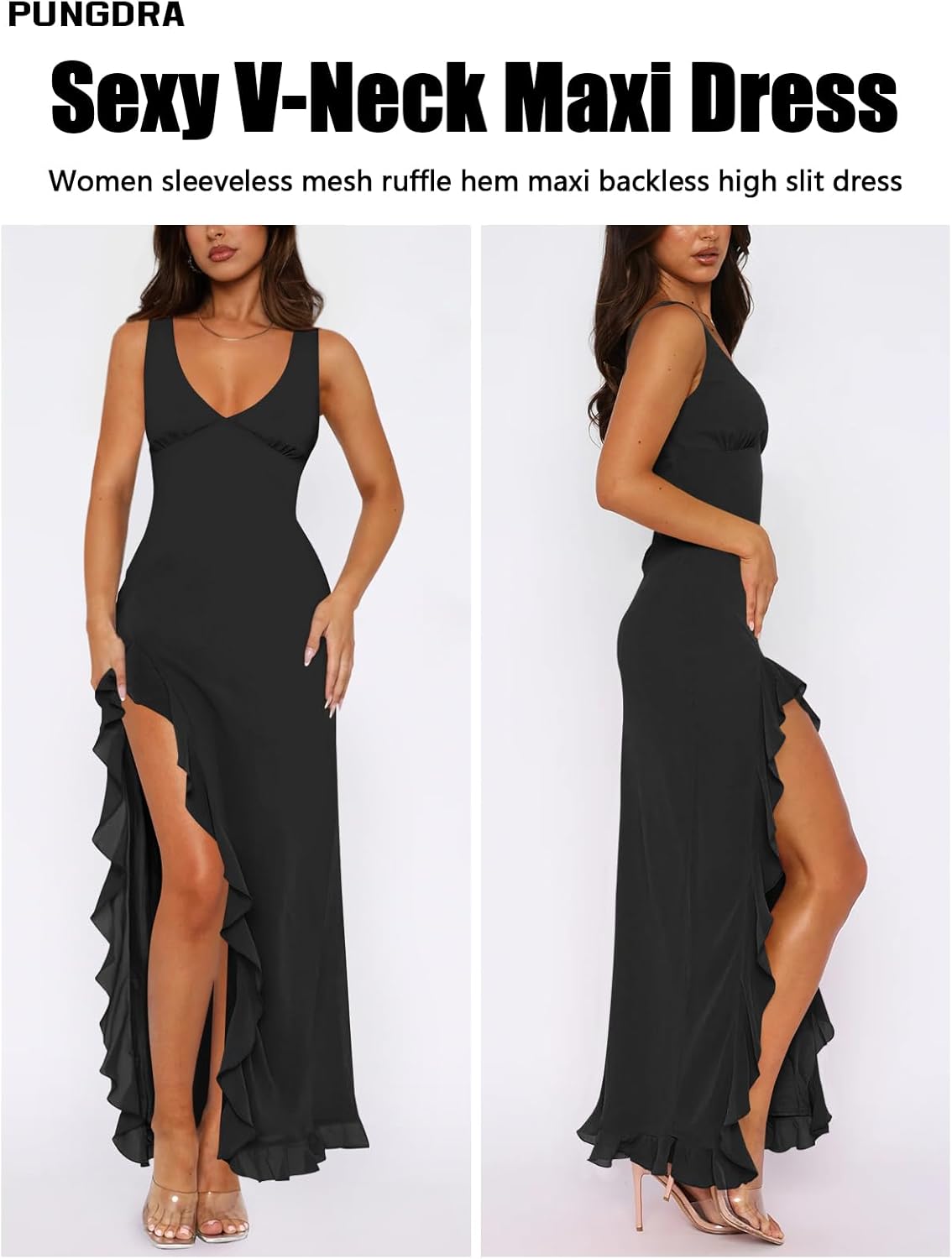 - 【Features】This mesh ruffle maxi dress is simple and trendy design.Sexy deep v-neck,sleeveless,backless,high slit,mesh ruffle hem,maxi length,slim fit,hugs your curves for a sexy yet elegant look.