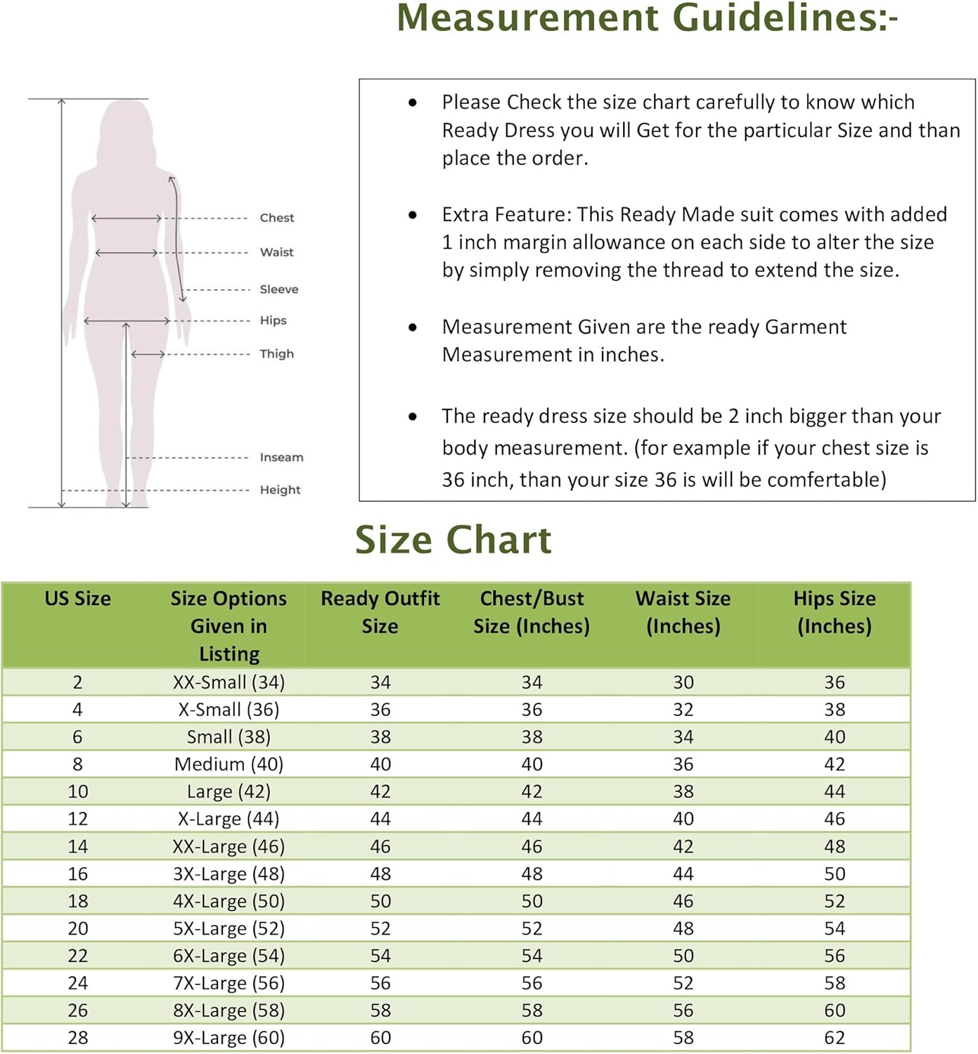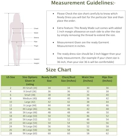 - SIZE CHART GUIDE :- The measurements in above Size Chart are considered as body measurements. The ready garment size will be 1-2 inches bigger than body measurements mentioned in the chart. The Ready Garment Size at Bust for all the above sizes in inches will be as following, (XS-36); (S-38); (M-40);( L-42);( XL-44); (XXL-46);