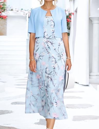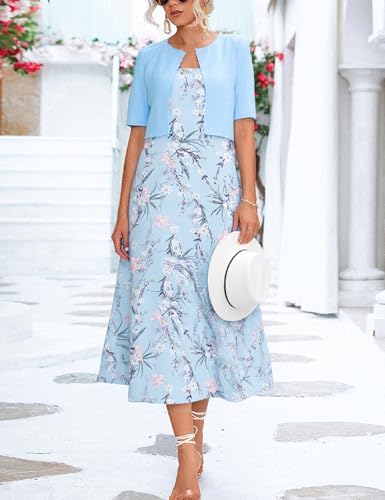 XNC Womens 2 Piece Set Fashion Fresh Plant Print Midi Dress V-Neck Half Sleeve with Jacket A-line Dresses Lounge Outfits