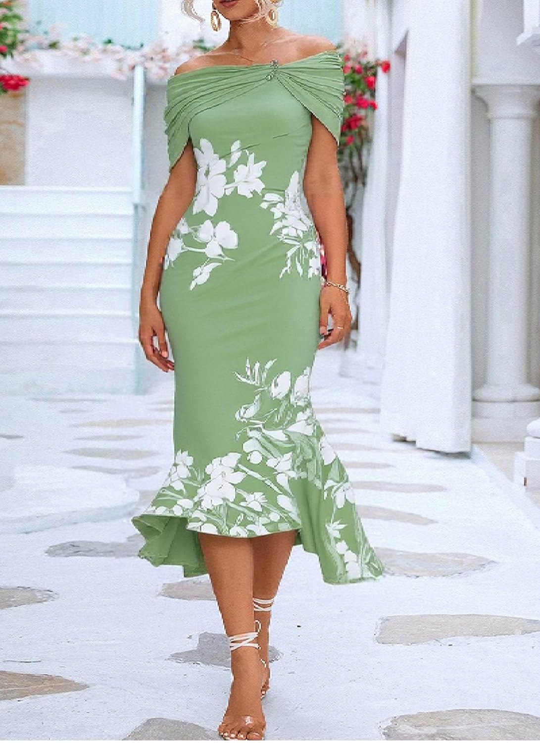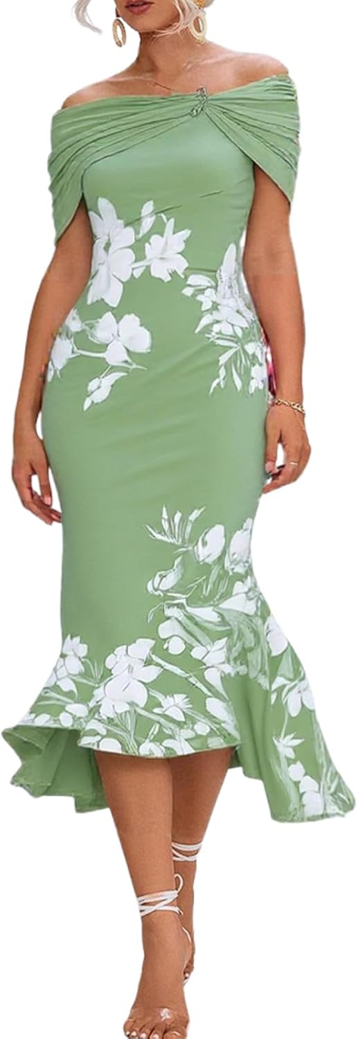 - Features: Elegant summer fall green fishtail dress, floral print off shoulder neckline, bodycon waist, beach vacation dress, floor length hem, flared fishtail silhouette, wedding guest dress maxi length, delicate pleated bust design, side floral prints, and flowing hem
