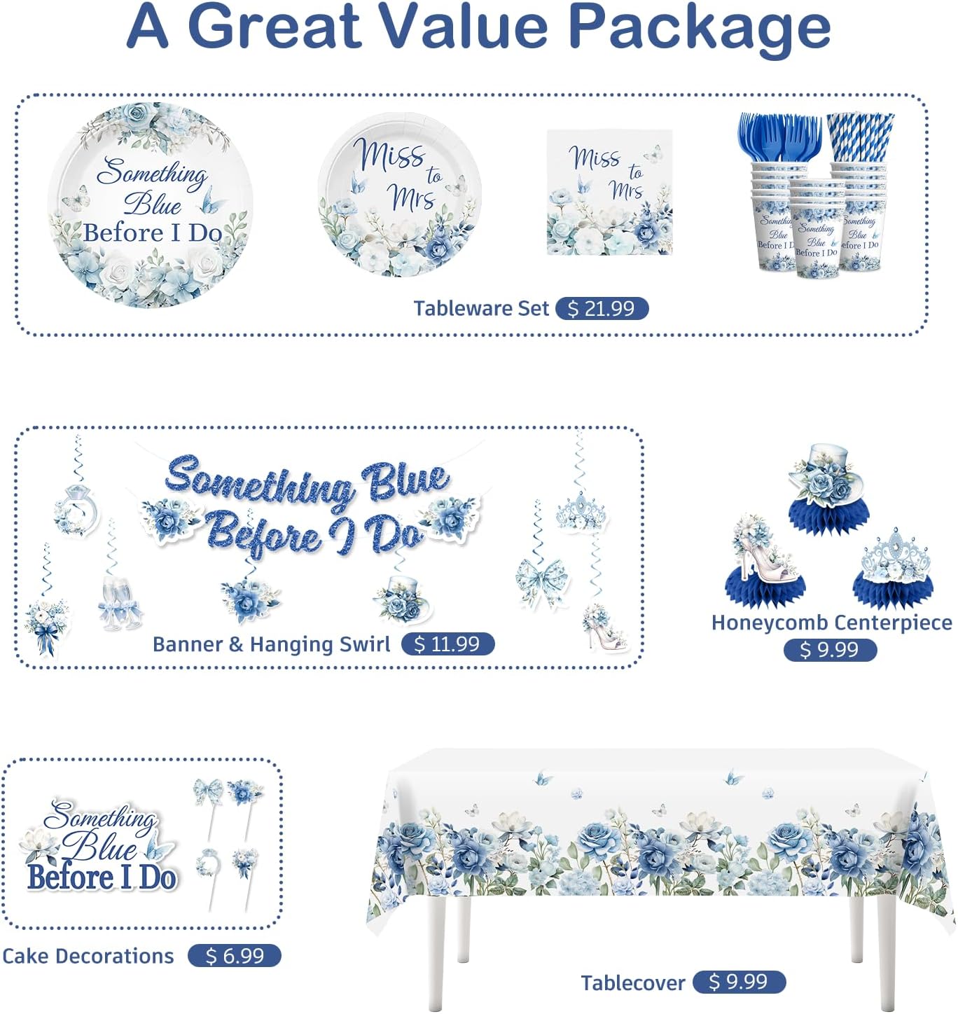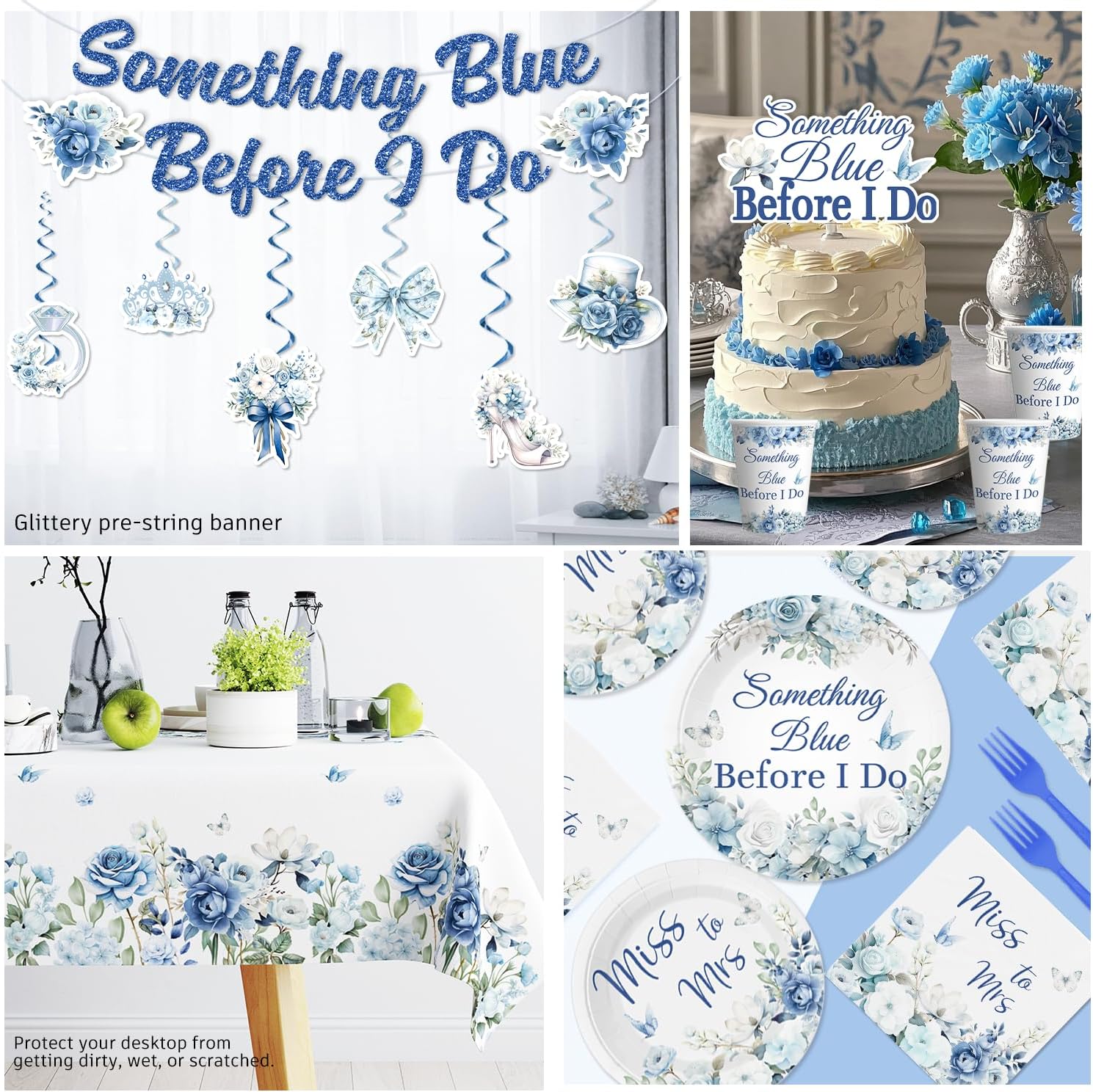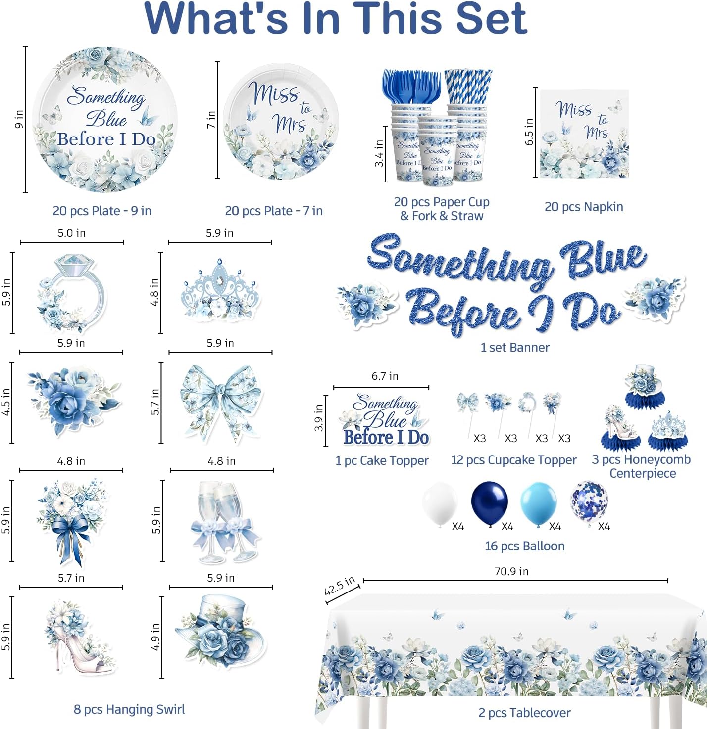 - 【Package includes:】Our something blue before i do bridal shower decorations include 1 something blue before i do banner, 8 double-sided printing hanging swirls,4 light blue + 4 dark blue single swirls, 1 cake topper, 12 cupcake toppers, 16 bridal shower balloons, 3 centerpieces, 2 blue bridal shower tablecloths, 20 7-inch bridal shower plates, 20 9-inch something blue before i do plates, 20 paper cups, 20 napkins, 20 forks and 20 paper straws