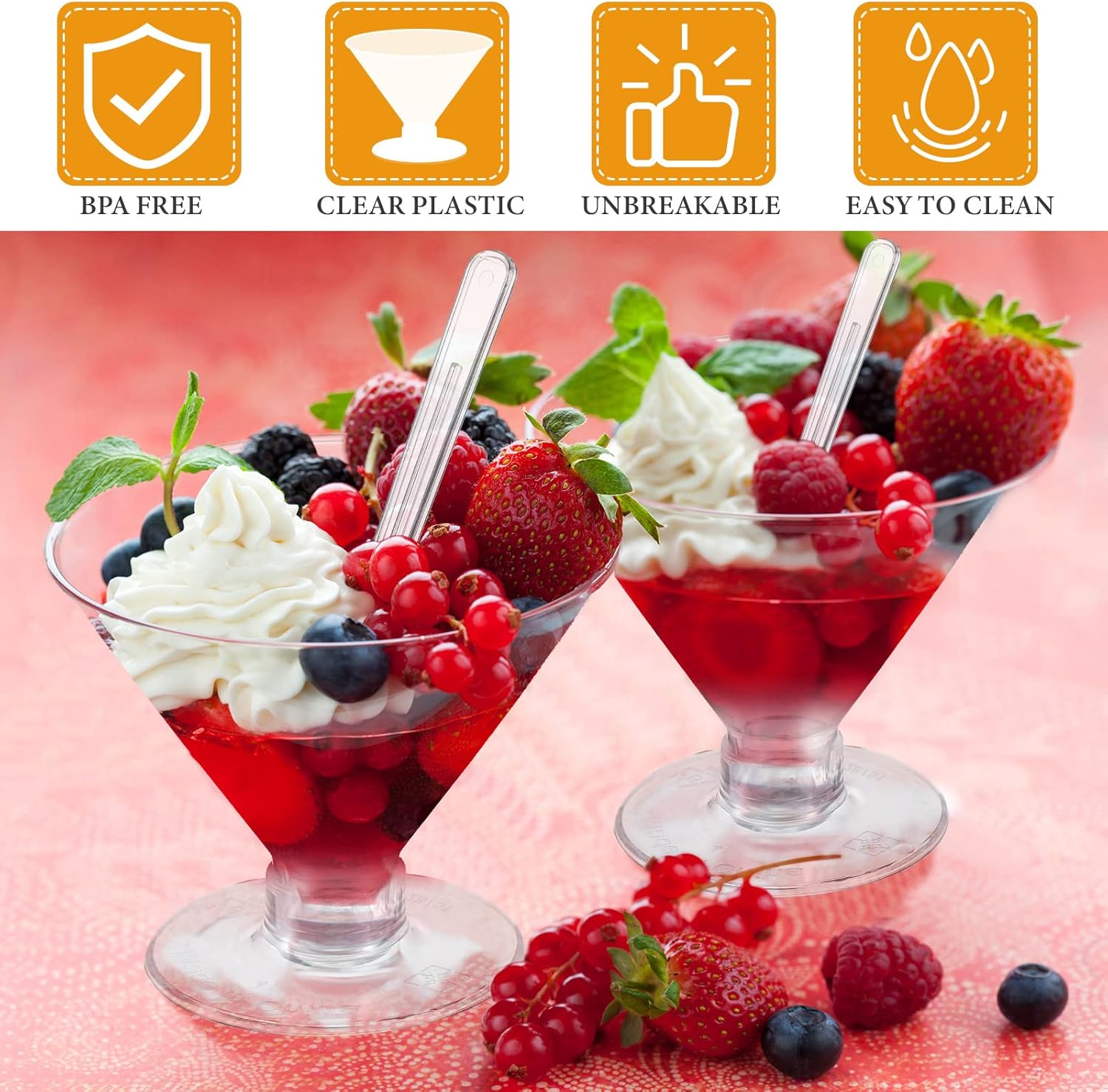 • Applicable Occasions: the parfait glasses plastic are ideal for birthday parties, barbecues, proms, baby showers, weddings, buffet, carnivals and more, and for many outdoor or indoor celebrations, providing you with a convenient and stylish display of desserts at the same time