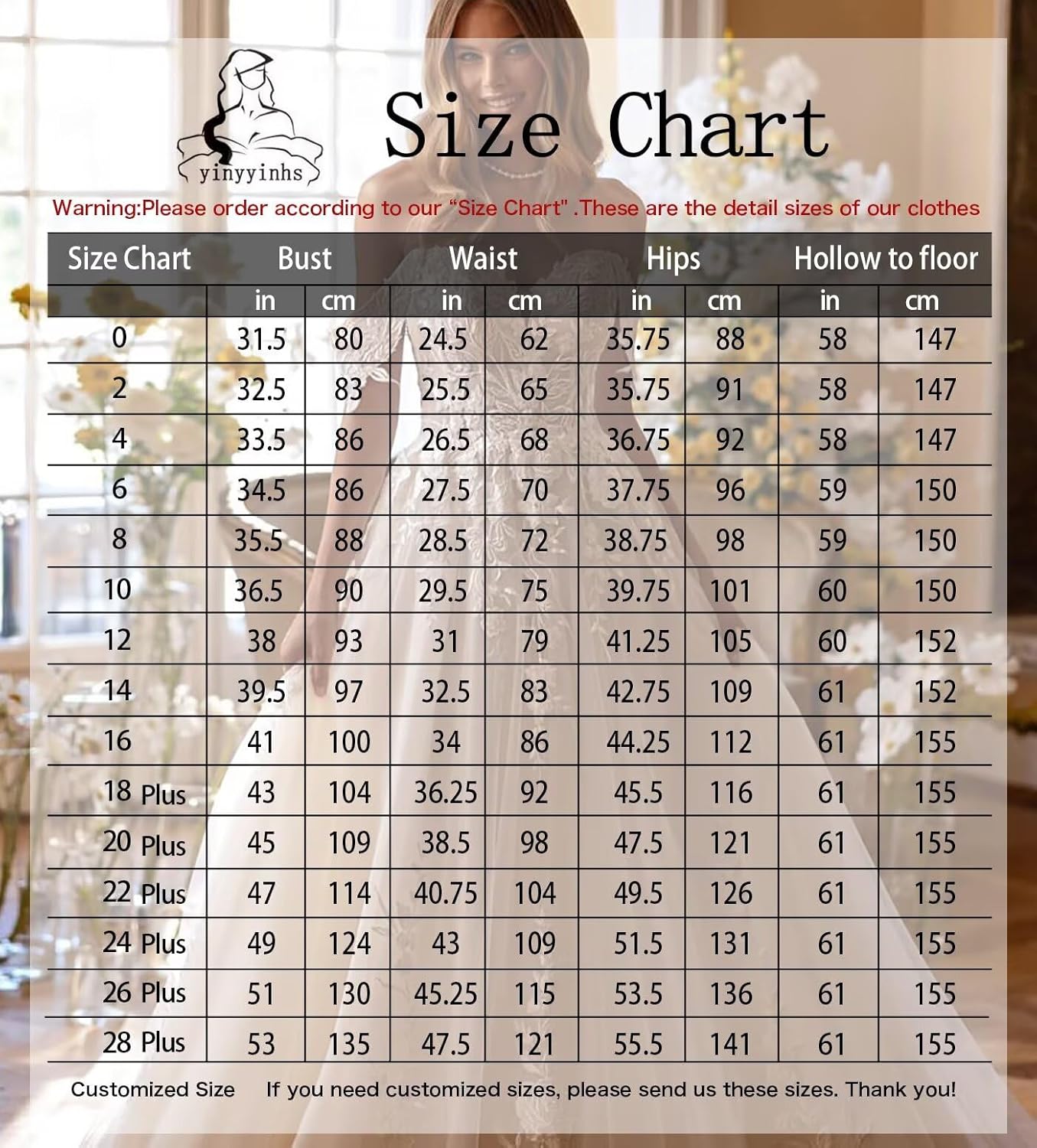 - Size:Choose this chiffon wedding dresses,please be sure your size according to the image of our “Size Chart” on the left.If you want to make the wedding bride gown fit you better,we can accept to customize freely for you,you can give us your exact measurements(bust,waist,hips,height,heel’s height)