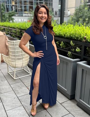 YMDUCH Womens Casual Short Sleeve Boat Neck Ruched High Split Bodycon Long Party Dress