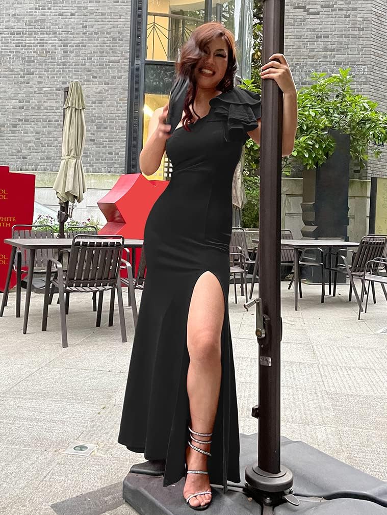 YMDUCH Womens Sexy Sleeveless One Shoulder Ruffle High Split Party Evening Long Formal Dress