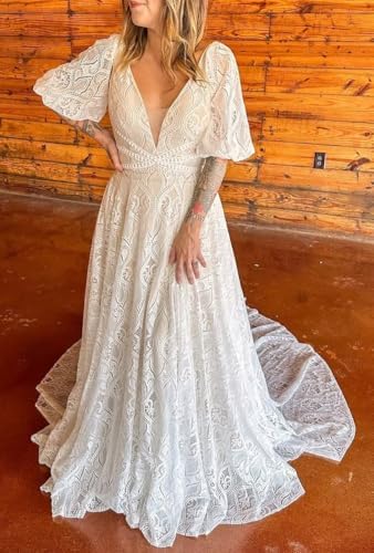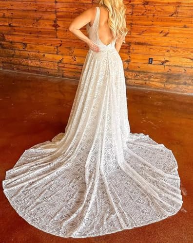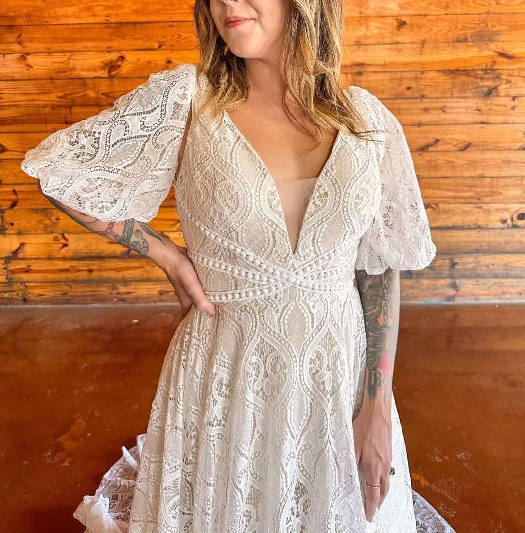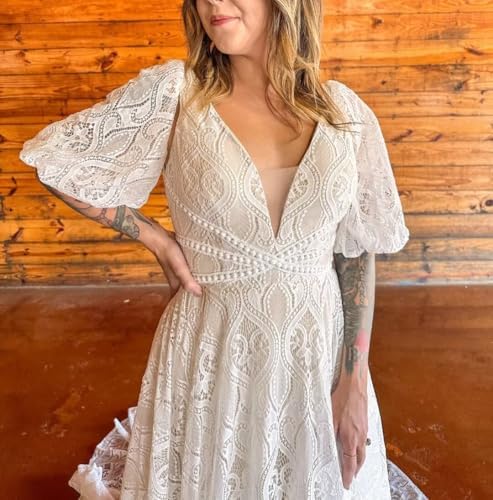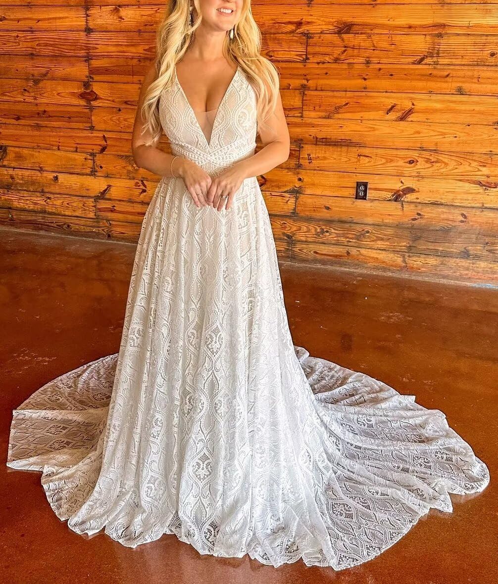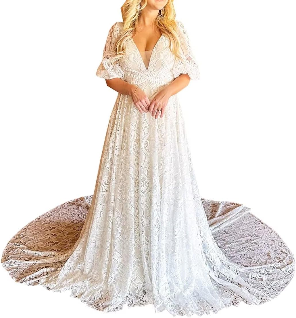 • This Boho Wedding Dress is A Gentle Fit and A Line Shape;This Beach Bride Dress Use High Quality Lace Fabric ;It is An Eye Catching Design;Lace Detachable Sleeves Style is Very Elegant;V Neck Style with Long Train Wedding Gowns