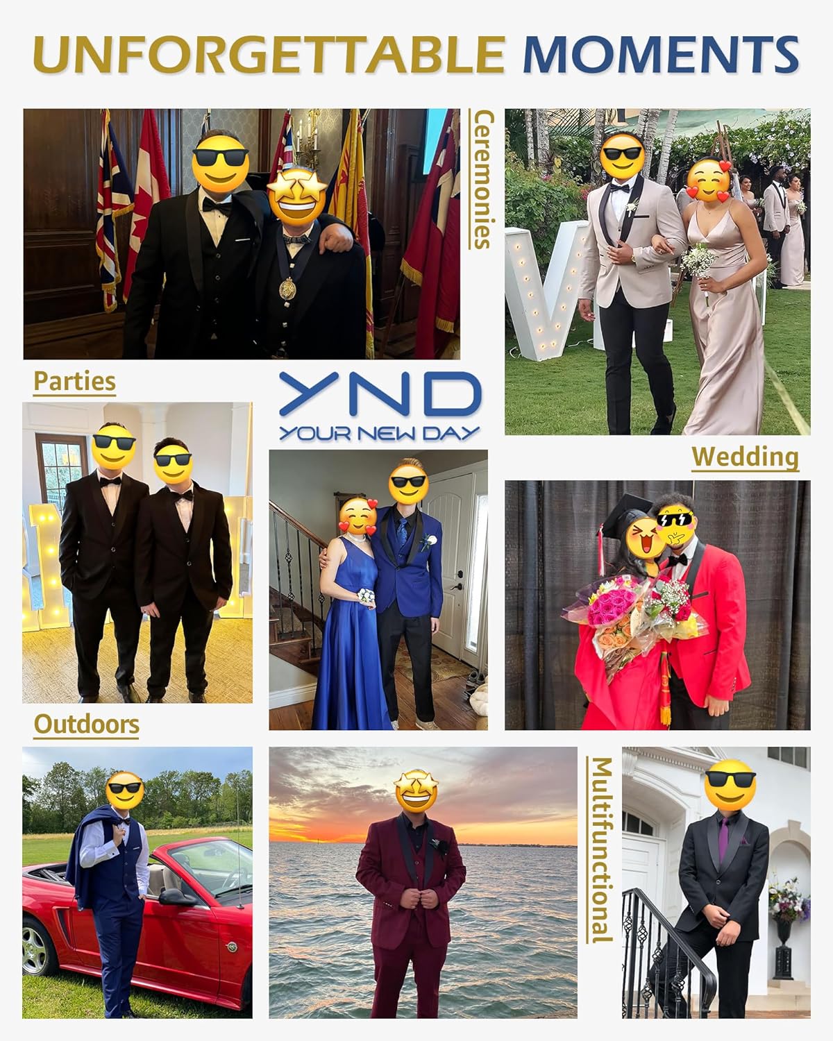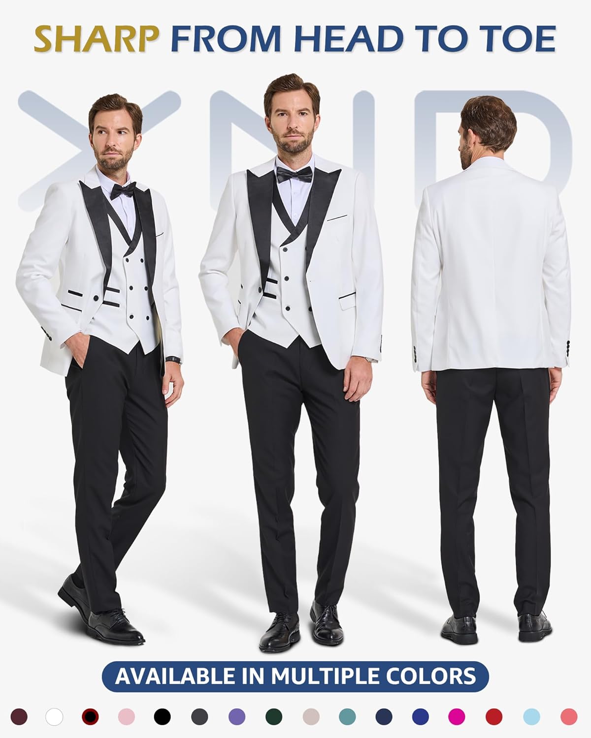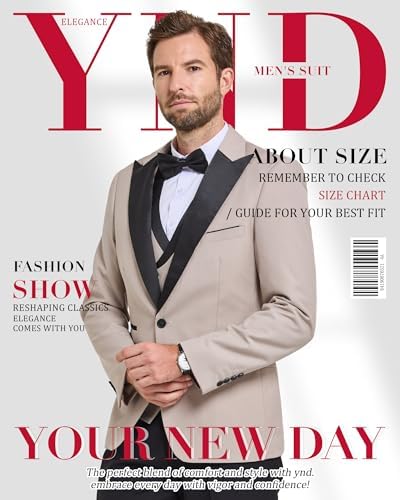 • YND – Your New Day! It’s a sleek 3-piece slim fit tuxedo featuring a one-button shawl lapel jacket, matching double-breasted vest, and pants. But wait, there’s more! It comes with a bow tie. Available in sizes from XS to 3XL, it offers a range of 16 colors. The genuine designs and shiny buttons on both the inside and outside pockets. We’re all about blending style, comfort, and affordability seamlessly. Curious why our suits are so popular? You will know when you see it!