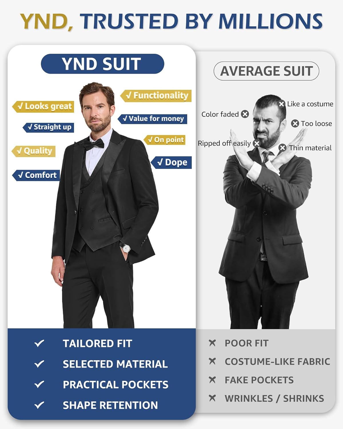 • Experience Top-notch Quality and Craftsmanship: YND suits embody quality and craftsmanship. We prioritize superior materials and meticulous attention to detail. Our fabric, handpicked for durability and breathability, outperforms average materials by 30%. Additionally, we’ve enhanced comfort by enlarging shoulder pads and chest linings. Each suit undergoes over 300 meticulous steps to ensure it mirrors the top-notch quality depicted in our pictures, focusing on even the minutest details.