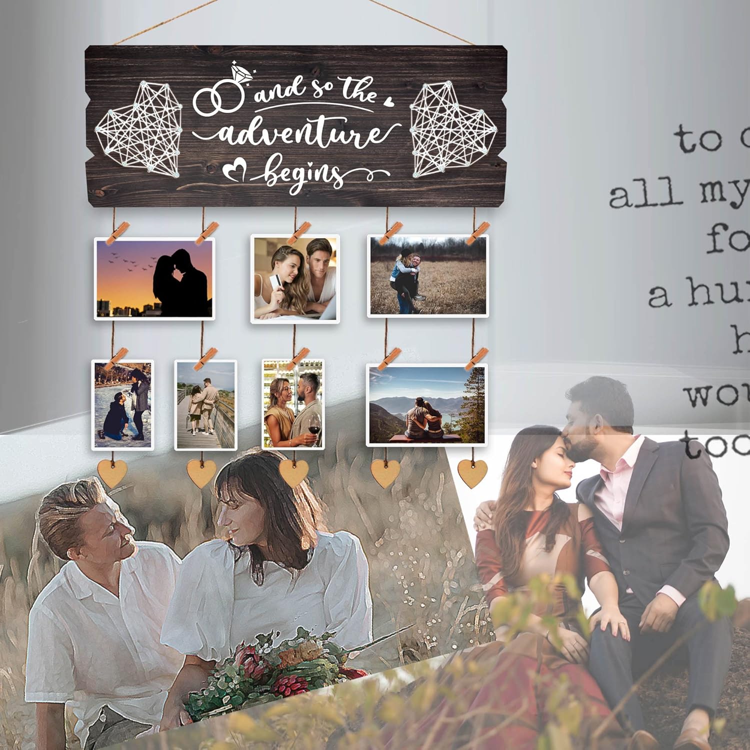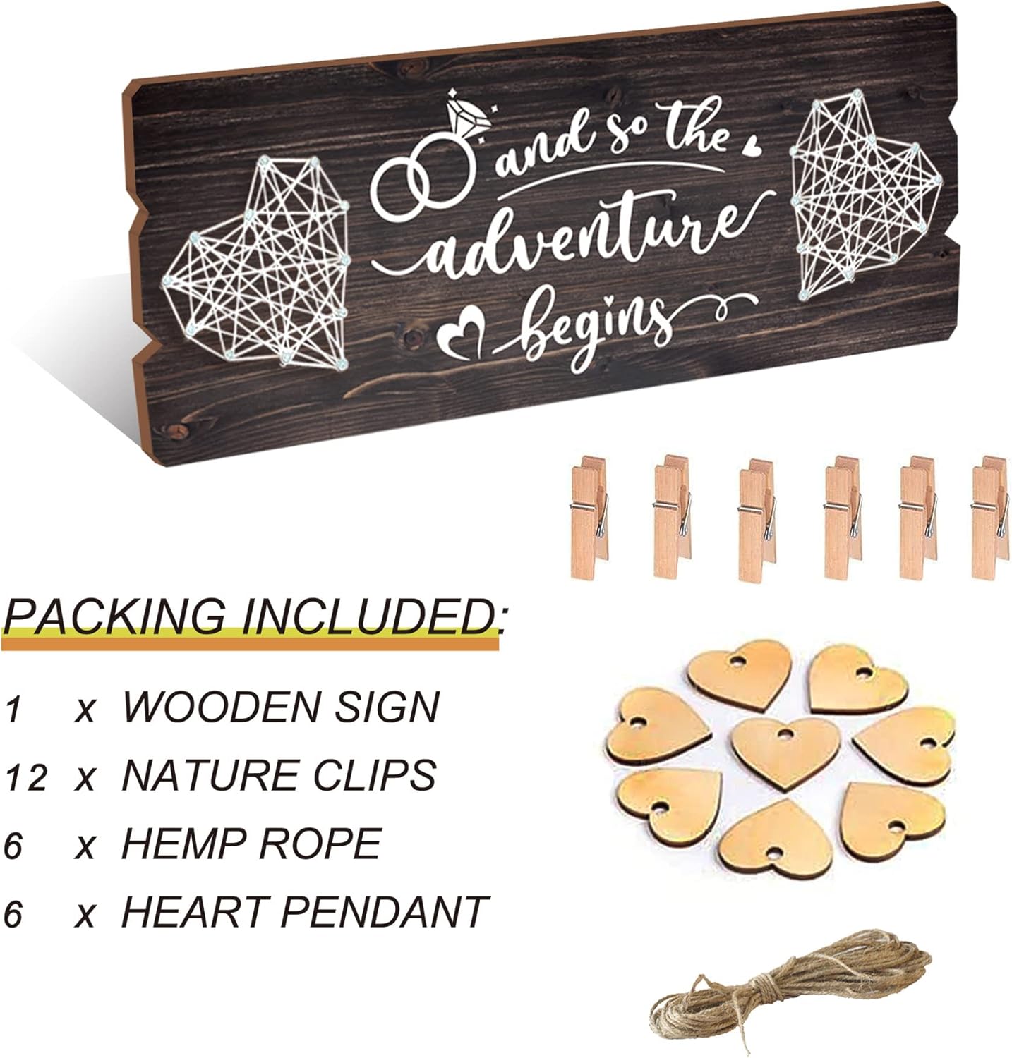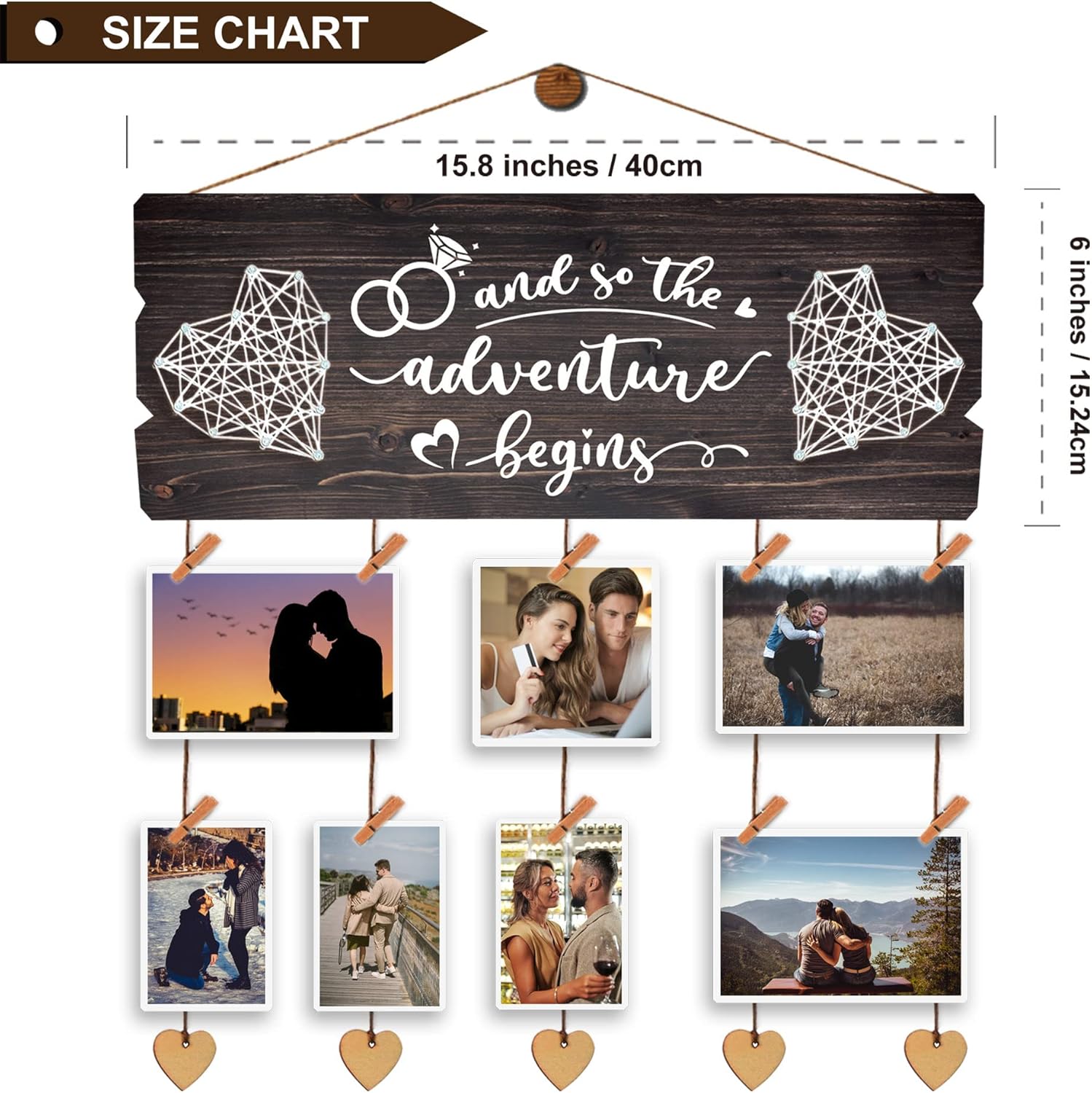 - LARGE AND PERFECT SIZE: Such love story board measures about 15.8×6 inches with 12 wooden clips and 6pcs 6pcs heart shaped twine , improved and much bigger than the similar items found on the market.