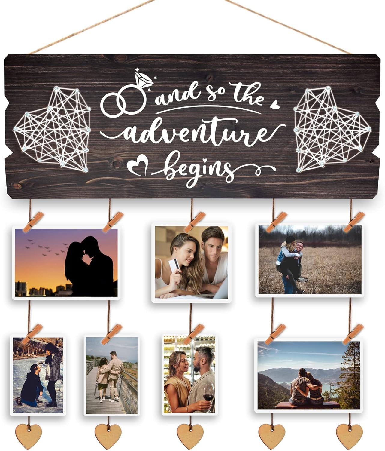 - HAND MADE AND EASY MOUNTING: Come with 12 wooden hearts clips ,Boards hand strung heart with hemp rope in a gift box ,Easy to hang on the wall and daily change your favoriate photos