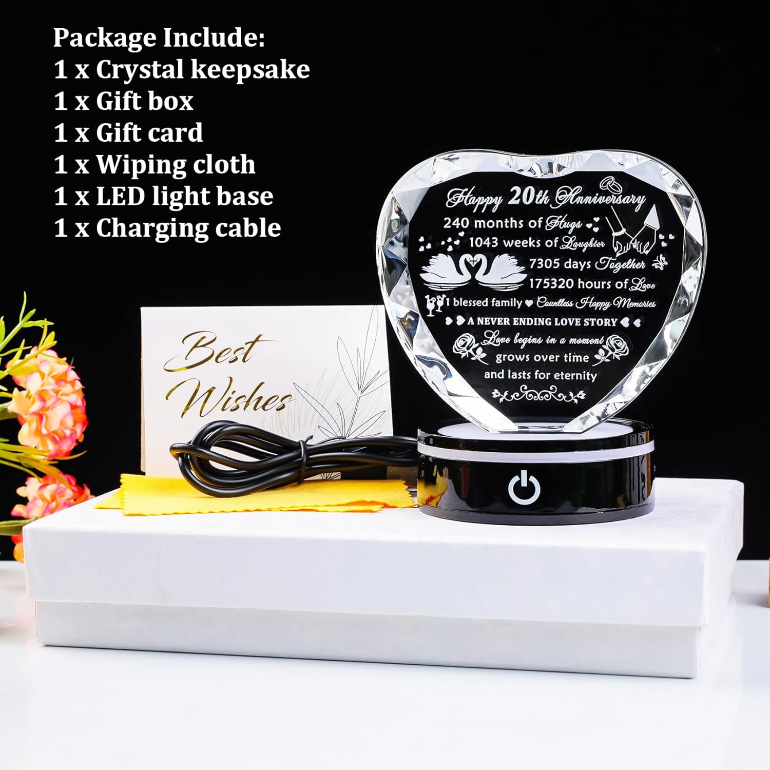 Happy 20th Anniversary 240 months of hugs 1043 weeks of laughter 7305 days together 175320 hours of love 1 blessed family Countless Happy Memories A Never Ending Love Story Love begins in a moment, grows over time, and lasts for eternity. If you are looking for a meaningful and romantic 20th wedding anniversary gift, this crystal heart-shaped keepsake will be a good choice. Special love quotes will tell your lover how much you love her, use the LED light base to light up the entire crystal to accompany her/him. High-quality crystal material and laser-engraved pattern make the keepsake durable. This crystal keepsake will document your marriage or love life and you can keep it forever. Product Specification:Material: K9 CrystalFeature: Laser engravingSize: 4.33″ x 3.94″x 1.18″Package Include:1 x Crystal keepsake1 x Gift box1 x Gift card1 x Wiping cloth1 x LED light base1 x Charging cableInstructions of the base:Press the button for the first time, the light will change colors very slowly. Press it again and the light will change colors faster. When the button is pressed for the third time, the light will change color to white and stop changing colors automatically and each time the switch is pressed thereafter, the light will change and stay in one color. The fourth time you press the button, the color of light is red; the fifth time is blue and the sixth time is green. Press it the seventh time, the light will turn off. Press and hold the switch for three seconds to turn off the light regardless of the mode.