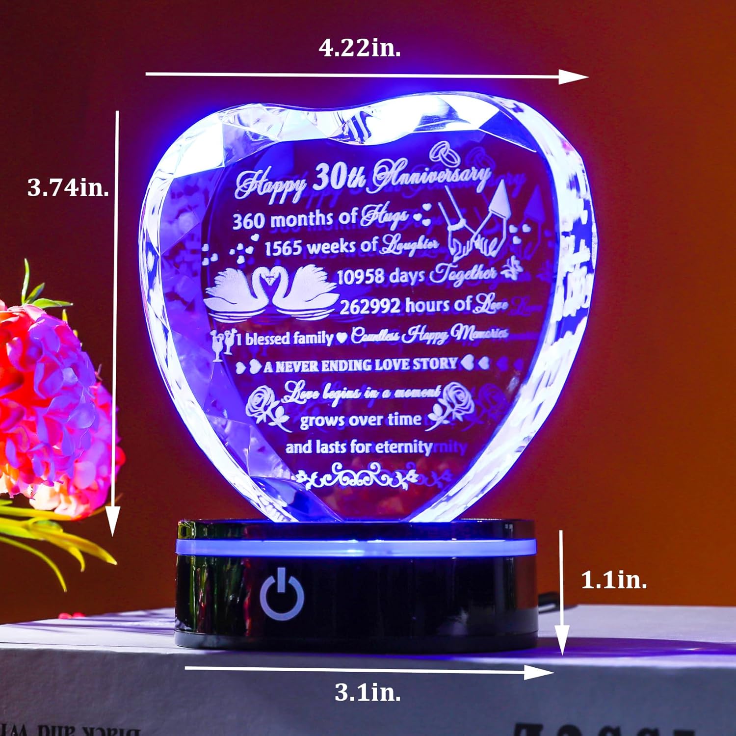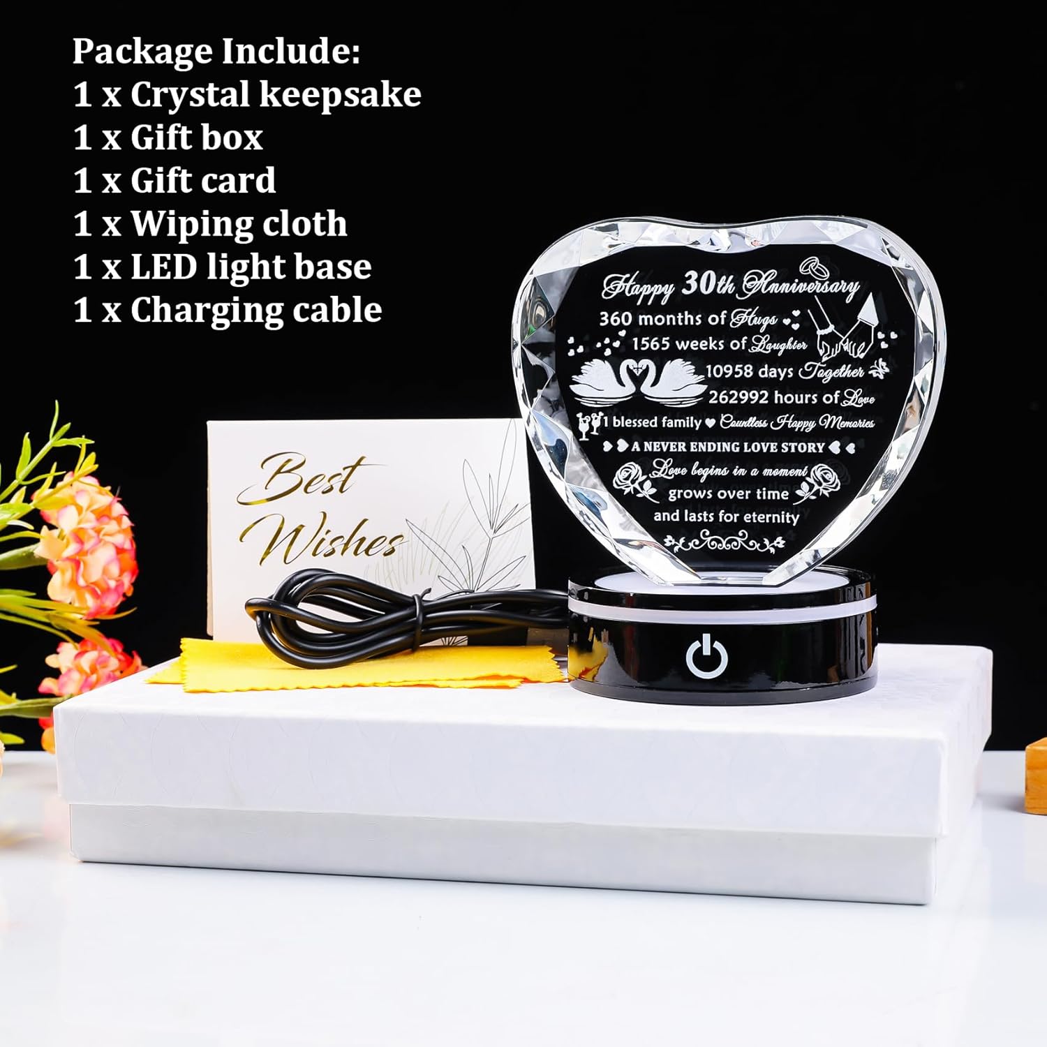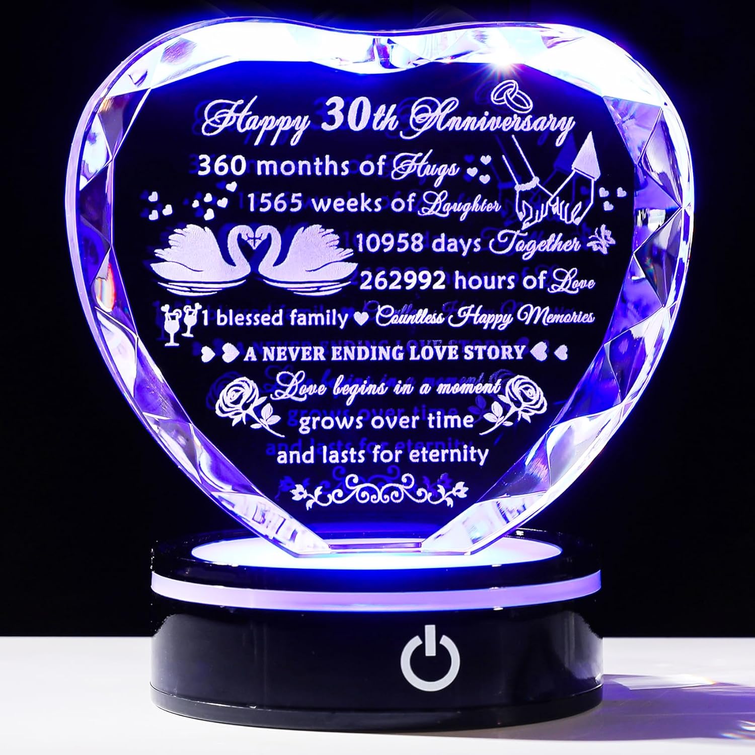 Happy 30th Anniversary 360 months of hugs 1565 weeks of laughter 10958 days together 262992 hours of love 1 blessed family Countless Happy Memories A Never Ending Love Story Love begins in a moment, grows over time, and lasts for eternity. If you are looking for a meaningful and romantic 30th wedding anniversary gift, this crystal heart-shaped keepsake will be a good choice. Special love quotes will tell your lover how much you love her, use the LED light base to light up the entire crystal to accompany her/him. High-quality crystal material and laser-engraved pattern make the keepsake durable. This crystal keepsake will document your marriage or love life and you can keep it forever. Product Specification:Material: K9 CrystalFeature: Laser engravingSize: 4.33″ x 3.94″x 1.18″Package Include:1 x Crystal keepsake1 x Gift box1 x Gift card1 x Wiping cloth1 x LED light base1 x Charging cableInstructions of the base:Press the button for the first time, the light will change colors very slowly. Press it again and the light will change colors faster. When the button is pressed for the third time, the light will change color to white and stop changing colors automatically and each time the switch is pressed thereafter, the light will change and stay in one color. The fourth time you press the button, the color of light is red; the fifth time is blue and the sixth time is green. Press it the seventh time, the light will turn off. Press and hold the switch for three seconds to turn off the light regardless of the mode.