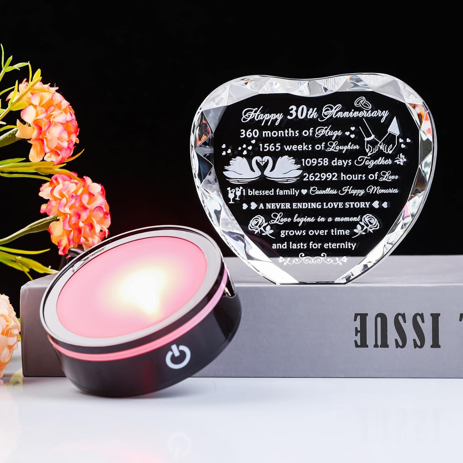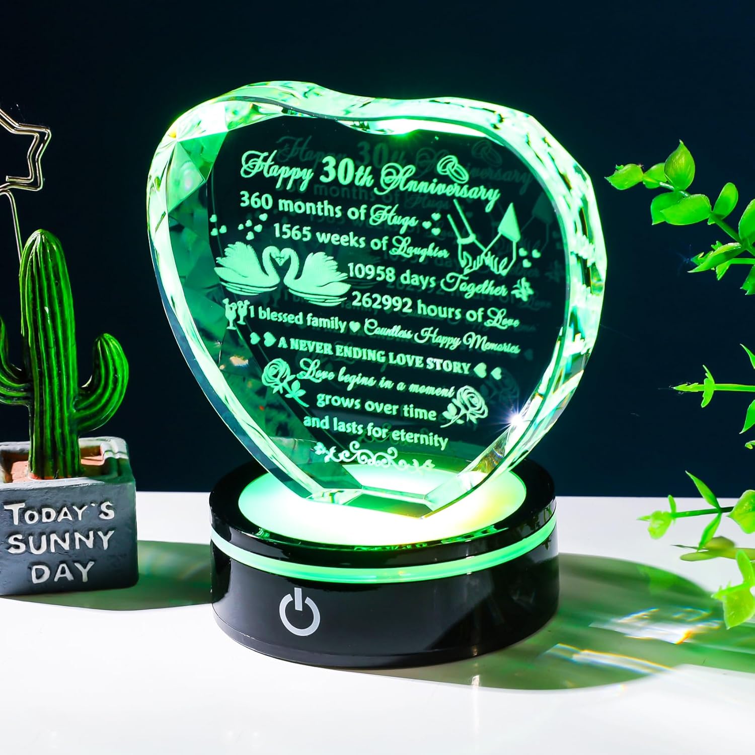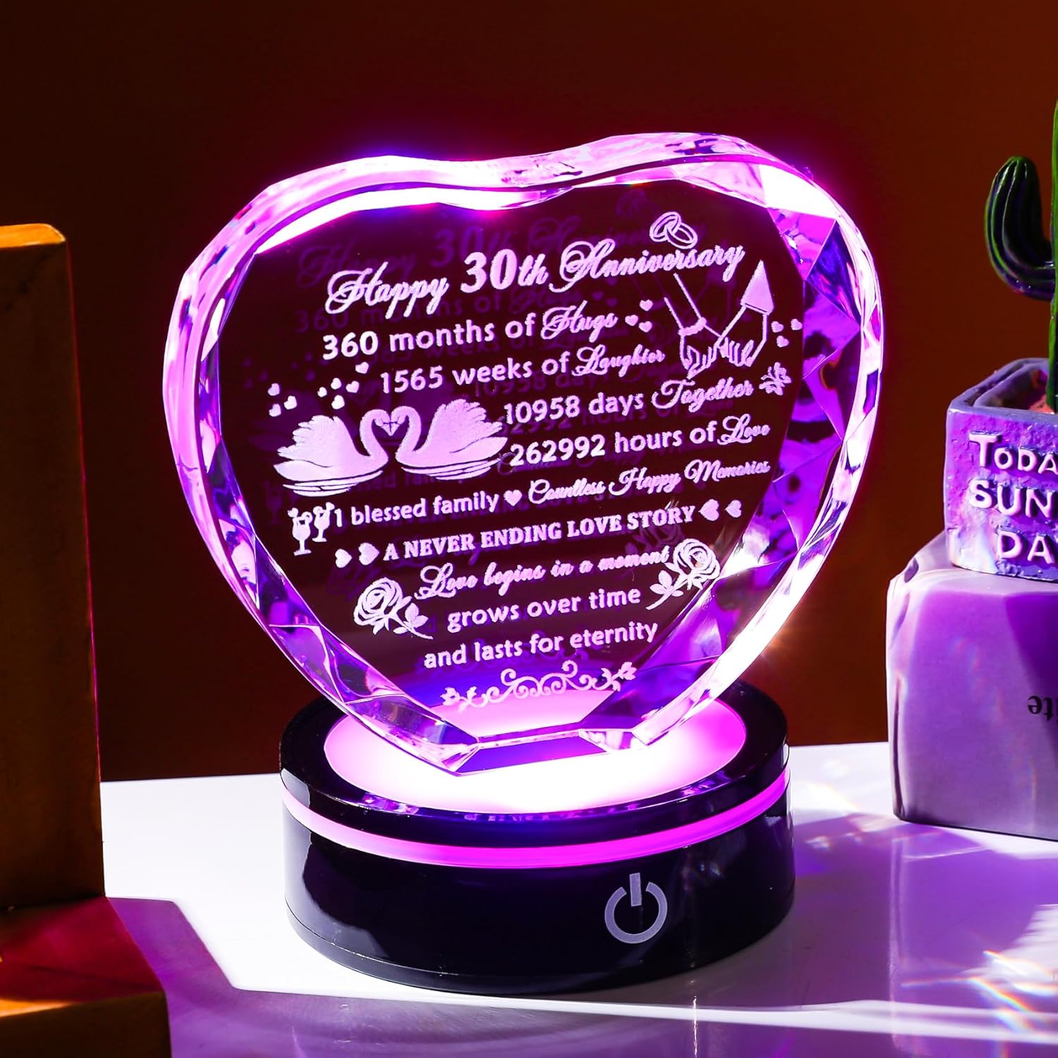 - High-Quality Crystal Material: The 30th-anniversary gift is made of high-quality K9 crystal, transparent and shiny, and can be used for a long time without tarnishing. All the patterns and texts are laser engraved inside the crystal. Not easily worn or faded. The light of the light base can change color automatically or fix the color, which can make the quotes clearer