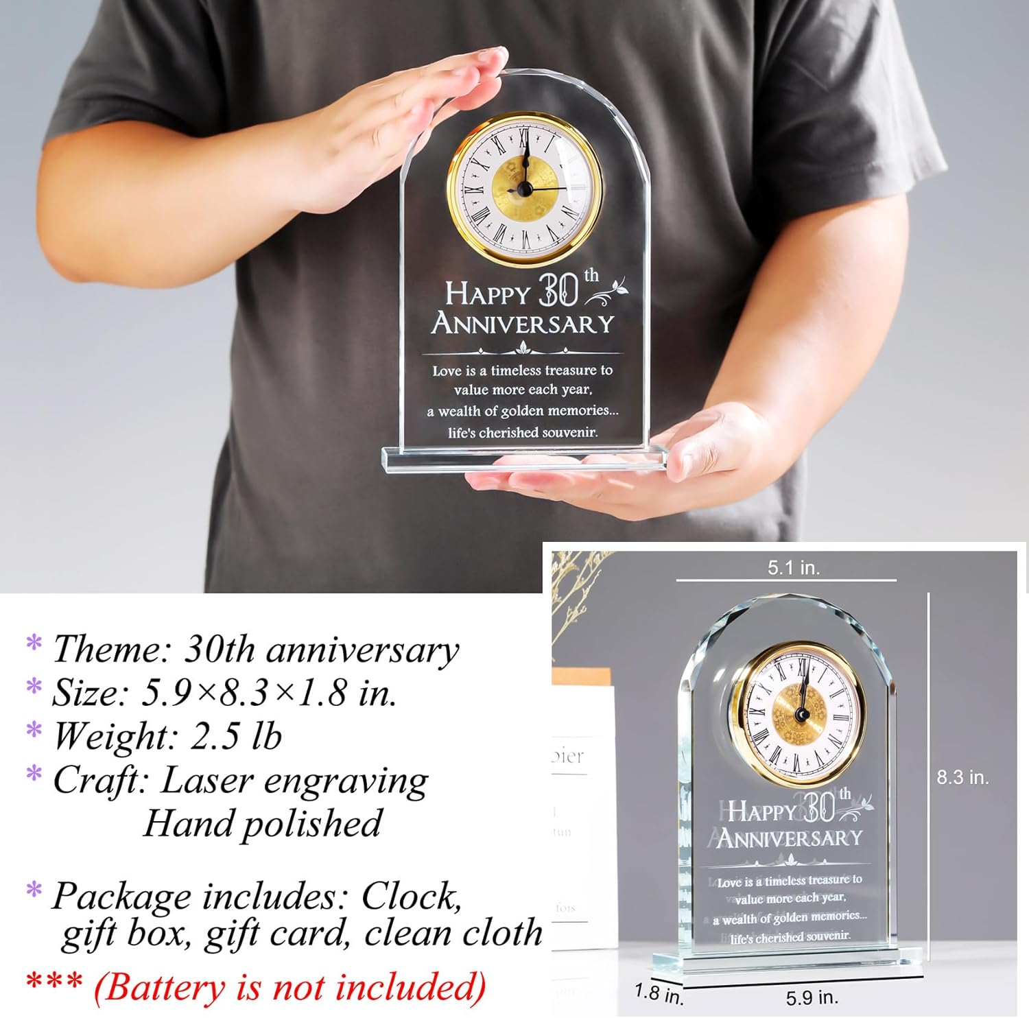 This clock present with special commemorative significance for the 30th anniversary of the wedding is undoubtedly the ideal choice for giving your wife or husband. This romantic gift is made of glass and incorporates the unique design of a quartz clock. On the glass clock, we also use laser engraving technology to engrave romantic words and patterns, which are not only wear-resistant but also can be preserved for a long time, just as your love is eternal. Product Specifications: Material: Glass Feature: Laser engraving Size: 5.9 x 1.8 x 8.3 in Net Weight: About 2.87 lb Package Include: 1 x Glass Clock keepsake 1 x Gift box 1 x Gift card 1 x Wiping cloth Note: The package does not contain a battery