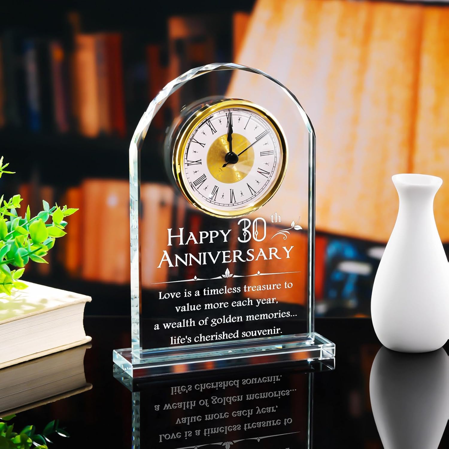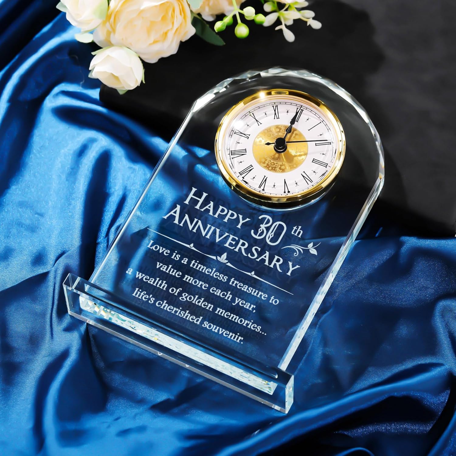 - Happy 30th Wedding Anniversary Gifts for Couples: This unique glass clock gift celebrates 30 years of marriage together, which symbolizes pure and eternal love. The romantic words and patterns on the glass keepsake will recall lasting and precious memories of the love you have during your 30 years of marriage